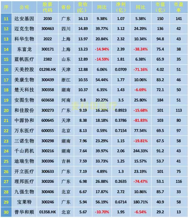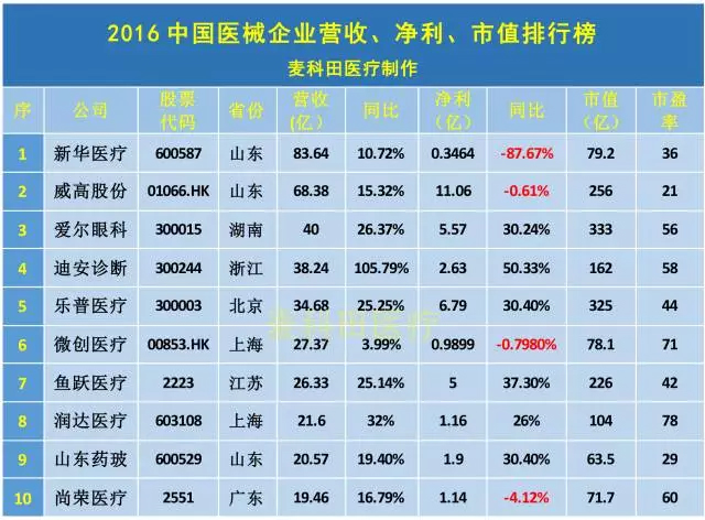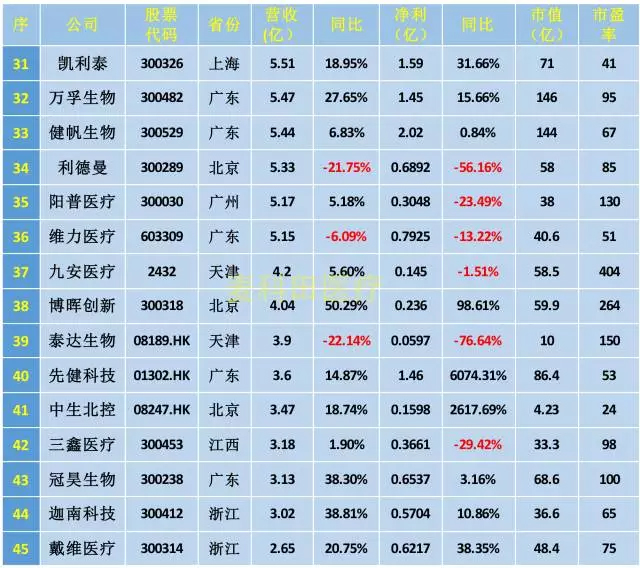 麦科田医疗独家分析: 01.本次榜单共有45家在国内或香港上市的企业上榜。 02.榜单中,共有27家企业营收实现同比正增长,18家同比负增长。 03.净利润排行前十位依次为:威高股份、乐普医疗、爱尔眼科、鱼跃医疗、安图生物、迈克生物、九强生物、迪安诊断、东富龙、科华生物。其中,8家企业营收实现同比正增长,2家同比负增长,分别是威高股份和东富龙。 04.市值排行前十位依次为:爱尔眼科、乐普医疗、威高股份、鱼跃医疗、安图生物、迪安诊断、达安基因、万孚生物、健帆生物、迈克生物。仅威高股份营收同比负增长,其余企业均实现同比正增长。 05.市盈率排行前十位依次为:九安医疗、博晖创新、泰达生物、达安基因、阳普医疗、理邦医疗、和佳股份、冠昊生物、三鑫医疗、万东医疗。其中,4家企业营收实现同比正增长,6家同比负增长。 06.对比医药上市企业,营业额排行第一的国药控股收入达2583.88亿元,而器械企业排行第一的新华医疗仅为83.64亿元。对比净利润,同样相差甚远:器械企业净利润排行第一的威高股份利润为11.06亿元,国药控股达68.92亿元。