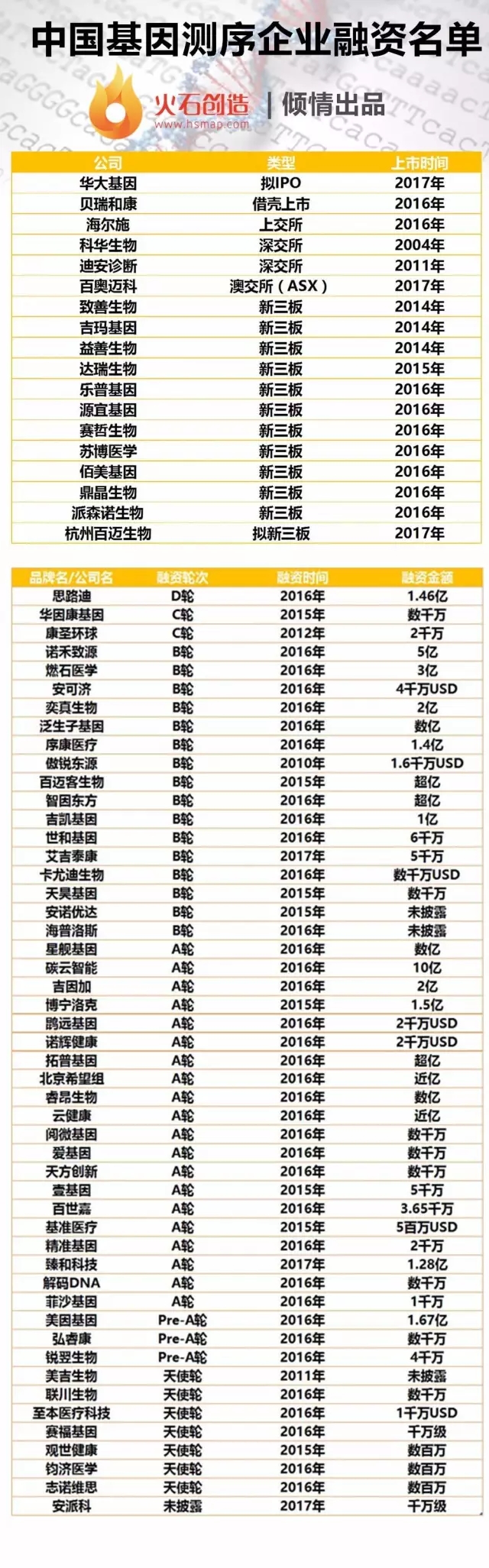 2015年中国启动精准医疗计划以来,作为精准医学核心技术的基因测序领域得到了快速的发展,得益于国家政策的大力扶持,一大批优秀的创业公司不断涌现,纷纷获得了资本的青睐。 自从2014年国家在基因测序领域定下基调,开始加强监管和规范市场以来,2015年各种政策不断出台,2016年又发布了专家共识,使得国内市场乘风而上,快速增长,产品的上市速度也不断加快。 虽然国内基因测序行业链中由测序仪和试剂耗材等形成的上游被外企寡头垄断,但是在产业链的中下游,相对集中于测序服务及应用的国内企业发展迅速、成绩斐然,并且也在不断寻求上游突围,也获得了不错的成绩。 火石创造基于HSMAP系统,对国内所有涉及基因测序业务的企业进行了扫描,筛选出了所有已经披露了投融资消息的企业,并将其最新一轮的融资情况进行了汇总。 最新一轮融资情况(详情见下表) 公司地域分布 数据显示,国内目前总共有11家新三板上市公司,其中有7家的上市时间都是2016年,杭州百迈生物于近日申请挂牌新三板。另外IPO公司总共4家,贝瑞和康在2016年12月以43亿借壳天兴仪表成功上市,也让它在上市速度上超过了其竞争对手华大基因。而2014年估值高达200亿的华大基因自2015年底提交IPO文件之后,就开始了其在创业板排队的万里长征。在2016年底被贝瑞和康抢先了一步之后,华大基因于今年3月又一次递交了招股说明书,但是截至笔者完稿,根据证监会发布的信息,其仍然处于正常的审核状态。 其他创业公司方面,2016年资本空前活跃,在这一年里完成了A轮和B轮融资的企业占了所有到目前为止已有融资记录企业的一半以上,并且频繁出现上亿甚至数亿的高额融资。 上表为大家呈现的是所有已有融资记录的公司最新一轮额融资情况以及涉及到的投资机构各自的布局企业,那么下面我们再从时间等角度来看一下包含所有融资记录的情况。 从上图中,我们很明确地可以看出来近三年来基因测序行业的发展情况,这也从一定程度上反映出了国家政策扶持对产业发展的影响。表中反映的仅仅是获得融资的公司数量情况,并没有包含具体的金额信息,事实上,从融资金额的信息来看,趋势也同样明显,2014年及以前的融资信息很多都没有披露具体的金额情况,但是根据已有的数据来看,三年中各轮次的融资金额也是水涨船高,即使抛开货币因素,也足以反应资本在大量涌入基因测序市场。 而从这张图中我们可以更加直观地了解到金额的分布情况,很明显,千万级和亿级的融资笔笔皆是,两者竟占到了75%以上。在这两个数量级的融资事件,金额毫无疑问是巨大的,这还不包括“数亿”的星舰未来生物科技有限公司、“过亿”的拓普基因以及10家“数千万”的公司。 不可否认基因测序行业的发展如雨后春笋般,近年来大笔的资本投入也曾让人担忧是否存在“泡沫”?基因测序领域是否开始或者已经过热? |