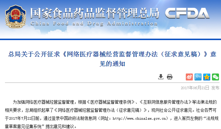 6月21日,为加强网络医疗器械经营监督管理,根据《医疗器械监督管理条例》、《互联网信息服务管理办法》等法律法规的相关要求,国家食品药品监督管理总局组织起草了《网络医疗器械经营监督管理办法(征求意见稿)》,现向社会公开征求意见。社会各界可于2017年7月22日前,通过登录中国政府法制信息网(网址:http://www.chinalaw.gov.cn),进入首页左侧的“法规规章草案意见征集系统”提出意见和建议。 食品药品监管总局 2017年6月21日 附件 网络医疗器械经营监督管理办法(征求意见稿) 第一章 总 则 第一条 为加强网络医疗器械经营监督管理,保障医疗器械安全,根据《医疗器械监督管理条例》、《互联网信息服务管理办法》等,制定本办法。 第二条 在中华人民共和国境内从事网络医疗器械经营、提供网络医疗器械交易第三方平台服务,应当遵守本办法。 第三条 国家食品药品监督管理总局主管全国网络医疗器械经营、网络医疗器械交易服务第三方平台监督管理工作。 县级以上食品药品监督管理部门负责本行政区域内网络医疗器械经营、网络医疗器械交易服务第三方平台监督管理工作。 第四条 从事网络医疗器械经营的企业、网络医疗器械交易服务第三方平台应当遵守医疗器械相关法规、规章,相关企业应当依法诚信经营,遵守商业道德,符合有关规范要求,保证医疗器械质量安全。 第五条 从事网络医疗器械经营的企业、网络医疗器械交易服务第三方平台应当建立网络交易质量安全管理制度。其中,通过自建网站从事网络医疗器械经营的企业和网络医疗器械交易服务第三方平台还应当具备与其规模相适应的办公场所,数据备份、故障恢复等技术条件,保障网络医疗器械经营数据和资料的可靠性、安全性和可追溯性。 第六条 从事网络医疗器械经营的企业、网络医疗器械交易服务第三方平台应当积极配合食品药品监督管理部门开展网络监测、抽样检验、现场检查等监督检查工作,按照食品药品监督管理部门的要求提供信息查询、数据提取等相关支持。 第二章 网络医疗器械经营 第七条 从事网络医疗器械经营的应当是医疗器械生产经营实体企业,应当先行依法取得医疗器械生产、经营许可或办理备案。法律法规规定不需要办理许可或备案的除外。 已取得《医疗器械生产许可证》的企业,通过网络销售本企业生产的医疗器械,不需要办理经营许可或备案。 第八条 从事网络医疗器械经营的企业,应当事先书面告知所在地设区的市级食品药品监督管理部门,并填写网络医疗器械经营信息表(附表1)。 从事网络医疗器械经营的企业,应当通过自建网站或经备案的网络医疗器械交易服务第三方平台开展网络医疗器械经营活动。 第九条 企业名称、法定代表人、企业负责人、网站名称、网络客户端应用程序名、网站域名、网站IP地址、电信业务经营许可证或非经营性互联网信息服务备案编号、医疗器械生产、经营许可证或备案凭证编号等填报信息发生变更的,应当书面告知所在地设区的市级食品药品监督管理部门,并变更网络医疗器械经营信息表(附表1)。 第十条 从事网络医疗器械经营的企业应当在其经营活动主页面显著位置展示其医疗器械生产、经营许可证或备案凭证,在产品页面中应展示产品医疗器械注册证或备案凭证。相关展示信息应当画面清晰,容易辨识。其中,医疗器械生产、经营许可证或备案凭证、医疗器械注册证或备案凭证的编号还应以文本形式展示。相关信息发生变更的应及时更新展示内容。 第十一条 从事网络医疗器械经营的企业在网上刊载的医疗器械名称、型号、规格、结构及组成、适用范围、医疗器械注册证编号或备案凭证编号、注册人或备案人信息、生产许可证或备案凭证编号、产品技术要求编号、禁忌症等信息应当与经注册或备案的相关内容保持一致。 第十二条 从事网络医疗器械经营的企业应当记录保存医疗器械经营信息,其记录保存时间不得少于医疗器械使用期限或失效日期满后2年;没有明确使用期限或失效日期的,保存时间不得少于5年;植入类医疗器械的经营信息应当永久保存。 第十三条 网络医疗器械经营范围应当与其许可或备案的范围一致。 医疗器械批发企业从事网络医疗器械经营,应当销售给具有资质的经营企业或使用单位。 医疗器械零售企业从事网络医疗器械经营,应当销售给消费者个人。 销售给消费者个人的医疗器械应当是可以由消费者个人自行使用的医疗器械,并符合其产品注册证或备案凭证中标明的适用范围和《医疗器械说明书和标签管理规定》第十条第(八)项的规定,其说明书除具安装和使用说明或图示,还应当具有安全使用的特别说明。 第十四条 从事网络医疗器械经营的企业应当按照医疗器械标签和说明书标明的条件贮存和运输医疗器械。 第十五条 从事网络医疗器械经营的企业与其填报信息不符或无法取得联系的,经所在地设区的市级食品药品监督管理部门公示后,依法注销其《医疗器械经营许可证》或在第二类医疗器械经营备案信息中予以标注,并向社会公告。相关网站,应移送相关省级通信主管部门处理。 第三章 网络医疗器械交易服务第三方平台 第十六条 网络医疗器械交易服务第三方平台,应当向所在地省级食品药品监督管理部门备案,填写网络医疗器械交易服务第三方
