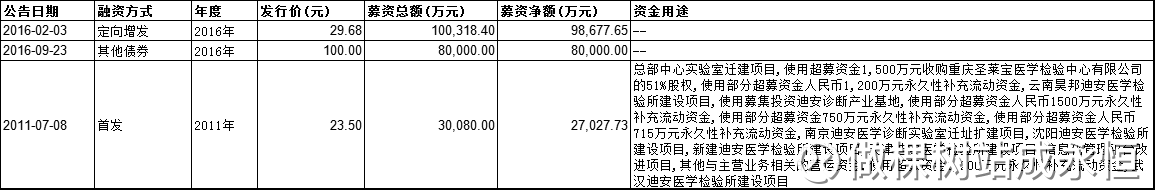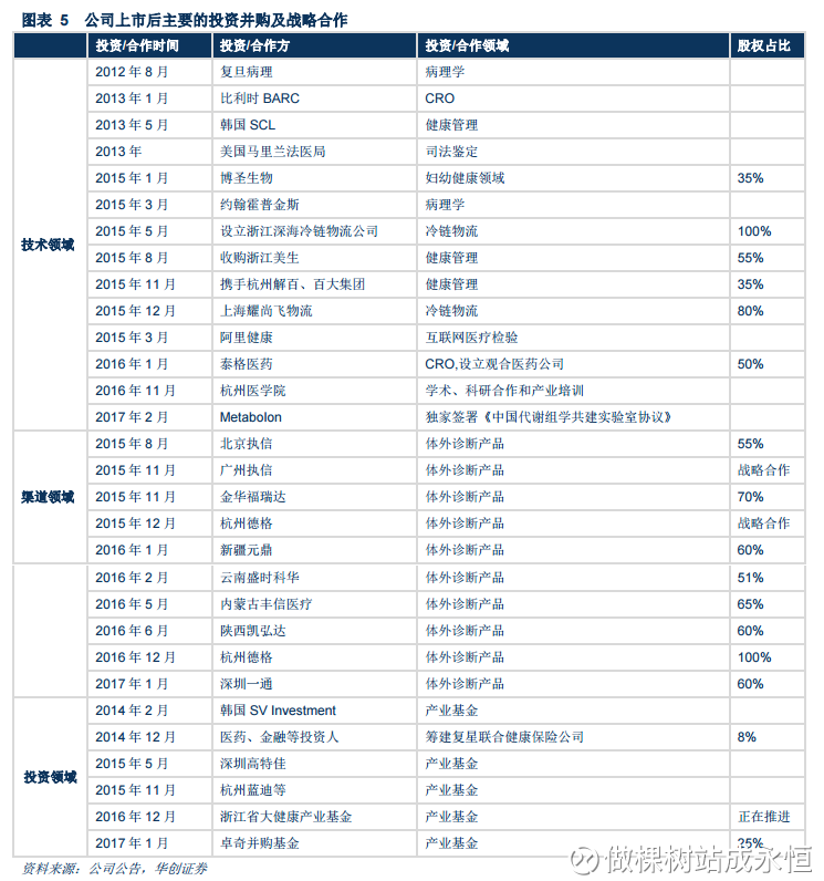 对IVD行业看好的逻辑是人均体检费用增加,对标发达国家现状是多少,中国现在是多少,差距是多少。按照这样的逻辑就大力看好(很多券商研报都这么写)。可再细想,总感觉哪里不太对。人均体检费用增加,在检测单价不变(医院控费大环境)的情况下,一增加受众人群,二增加更多的检测项目。受众人群增加的来源可能是三四线城市,这跟国家推行的分级诊疗似乎没啥关系,重点在于如何提高县级城市的医疗水平;检测项目的增加可以理解为新技术带来的新项目,和逻辑二雷同,而加强慢性病的监测,更多责任在于病人自我的管理,场景更多是在家中。用“人均体验费用增加”这个逻辑看问题,不是很好的角度。 推翻换个思路,国家现推行分级诊疗,要解决的问题是人们一有病就往大医院跑,无法实现大医院看大病,小医院看小病。大医院人满为患,社区医院无人问津,同时医疗资源也存在严重失衡。畅想一下,未来,社区门诊就是“家庭医生”,负责小病和慢性病的监测;二级医院看大病,三级医院看重病。医院按病收取诊疗服务费用,药在医院和药店的采购流程和价格透明,检验科和病理科的检测分析业务同时外包给第三方独立医学实验室,然后所有患者病理档案电子化,全网通查。 理想很丰满,现实很骨感。医院是事业单位编制,却是需要自负盈亏的进行KPI考核。医药的“两票制”已经是动到医院和医生的奶酪,那么检验科和病理科的检测项目外包对于三甲医院是没有动力滴,这部分是利润来源之一。而三级医院的检验体量占比超一半,对于下沉到三四线城市建立实验室,存在着回报周期长的问题。基于此,就出现了为医院提供集约采购服务的企业,如上海润达医疗、武汉塞力斯、宁波海尔施等。这类企业更像经销商而有别于试剂厂商,握有客户端医院的资源,善于供应链管理,建立物流体系。 医院检验分为普检和特检,特检由于体量小,有一定技术先进性,而愿意委托第三方机构。基于此,就出现了提供特定项目检测服务的企业,如华大基因、贝瑞和康、博奥检测、益善生物等。这类企业目前主要集中在分子检测领域,检测项目体量不大,而自建实验室成本高,关键一线大城市布局后很难实现全国范围覆盖。在推广服务的同时,相继都生产销售相关试剂产品。 而血统纯正的第三方实验室杭州迪安检测、广州金域检测,基本完成全国布局后也出现向上游经销商和试剂厂商扩张,同时提出2.0服务外包向3.0合作共建升级。 同时,试剂厂商也意识到未来趋势对标美国的话,第三方实验室将是检验科外包的必然产物,继而进入实验室布局,相关企业有美康生物、达安基因、凯普生物。 IVD的产业链并不长,按理分析起来是不难的。国家加大对医疗系统改革,先后推出了很多政策,身处其中的企业也是各自根据现实情况进行战略布局。以下重点解析一下迪安诊断和润达医疗,分别代表提供服务的不同形式。 1.迪安诊断300244 ① 基本情况: 城市:杭州市,股价29.6元/股,股本5.51亿股,总市值163亿元,PE 58.4倍。 董事长陈海斌1969,控股占比39.6%,实际控制人。 ② 业务情况: 主营业务是独立医学实验室(Independent Clinical Laboratory,ICL),是将原本属于医院检验科、病理科的检验业务外包进行集中检验,具有显著的规模效应,通过规模化经营、专业化分工提升了检验效率及检验水平。已建立连锁实验室31家,在建实验室4家,遍布全国25个省市,可提供2000余项医学检测项目,为全国12000多家医疗机构提供服务,形成中心实验室、区域检验中心、合作共建实验室三级联动。半数已进入盈利阶段,单体营收可超5000万,杭州、南京、北京、上海等成熟实验室收入过亿。 ![]() 除此之外,迪安也是非常早进行战略布局,向多个相关子行业进军。个人觉得是好棋的是通过收购经销商来向上游布局,收购标的也是非主流城市(新疆、云南、陕西、内蒙古),对于下游医疗机构客户有一定协同性。还有布局冷链物流(杭州深海冷链),这个是服务的关键之一,对于保证样品安全性和时效性非常重要。而司法鉴定的体量可能不大,对于建立专业权威性非常有帮助。具体明细参照下图。 ![]() ![]() ③ 管理层情况 董事长陈海斌1969, 1984年9月-1987年6月 毕业于安吉二中 1987年9月-1991年6月 毕业于上海理工大学科技英语专业 本科 1991年7月-1992年7月 任职于杭州汽轮机厂情报处; 1992年7月-1994年6月 任职于珠海达利实业有限公司厂长; 1994年6月-1995年12月 任职于广州复瑞科技实业有限公司总经理; 1995年12月-2001年8月 从事医疗器械代理业务; 2001年9月-至今 创办浙江迪安诊断技术股份有限公司,任董事长兼总经理; 以上是百度百科里面的资料,补充一下,1994年,陈海斌受高中同学汪群斌的力邀,他加入了刚刚成立的广州复瑞科技实业有限公司(上海复星的前身),由此迈入健康行业。他们的项目是郭广昌在复旦生命科学院找到的一种新型基因诊断产品——当时颇为先进的PCR乙型肝炎诊断试剂。在合作方式上,复星提供基因诊断检测设备和技术人员,医院提供场地,利润两家分成。而陈海斌担任总经理,负责开拓市场。(来源网络搜索) 这样具有资本市场背景的管理者,对于自身市值管理方面做得一般会比较好,同时也更懂的使用一些资本市场资源,服务自身发展。 ④ 资本运作 ü 直接融资的情况如下,其中2016年2月定增价29.68元,相当于除权后价格16.49元,对象有陈海斌(认股1