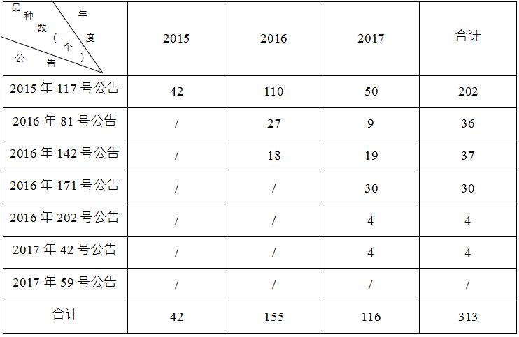 表2. 药物临床试验数据自查核查品种情况 三、核查工作进度 截止到 2017 年 6 月底,核查中心共派出检查组 185 个,组织 检查员 1635 人次,对 313 个(见表 3)已提交自查资料的药品注 册申请进行了临床试验数据现场核查,其中新药注册申请 94 个, 仿制药注册申请 37 个,进口药注册申请 182 个。核查药物临床 试验机构 763 家次,生物样本分析单位 121 家次,分布于全国 28 个省、自治区和直辖市。