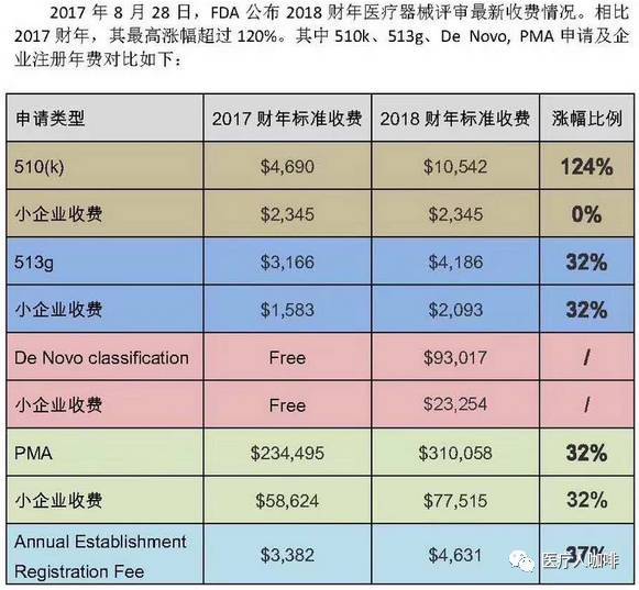 摘要: 近日,FDA发布了2018财年最新收费标准。药品方面医疗器械方面510(k)收费大涨124%,中小企业(年收入小于1亿美元)收费涨32%,工厂注册年费涨幅37%,中低风险创新器械De Novo新增审核费23254美元(之前为免费)。以下 ...