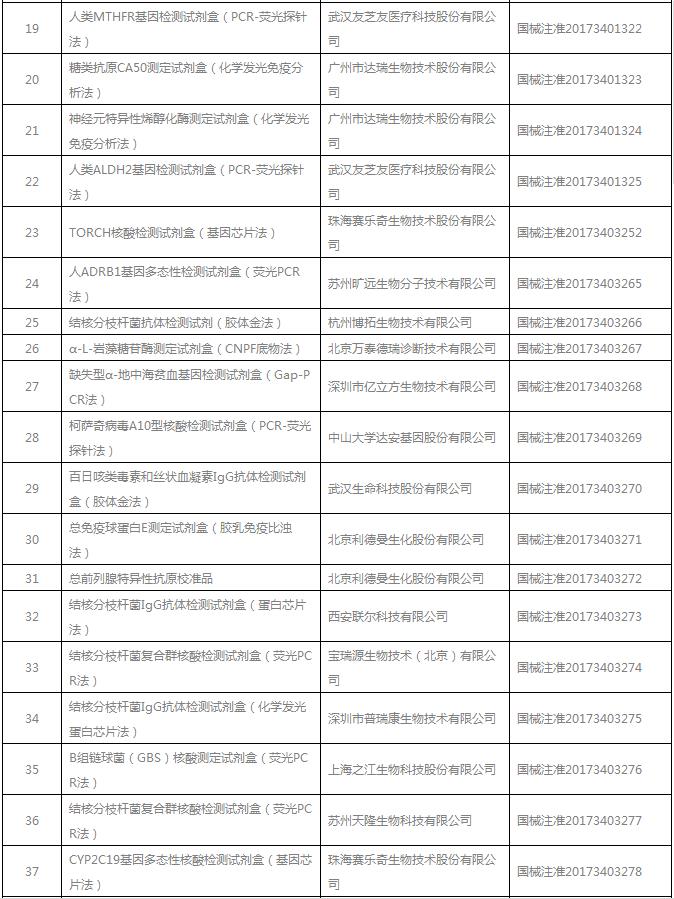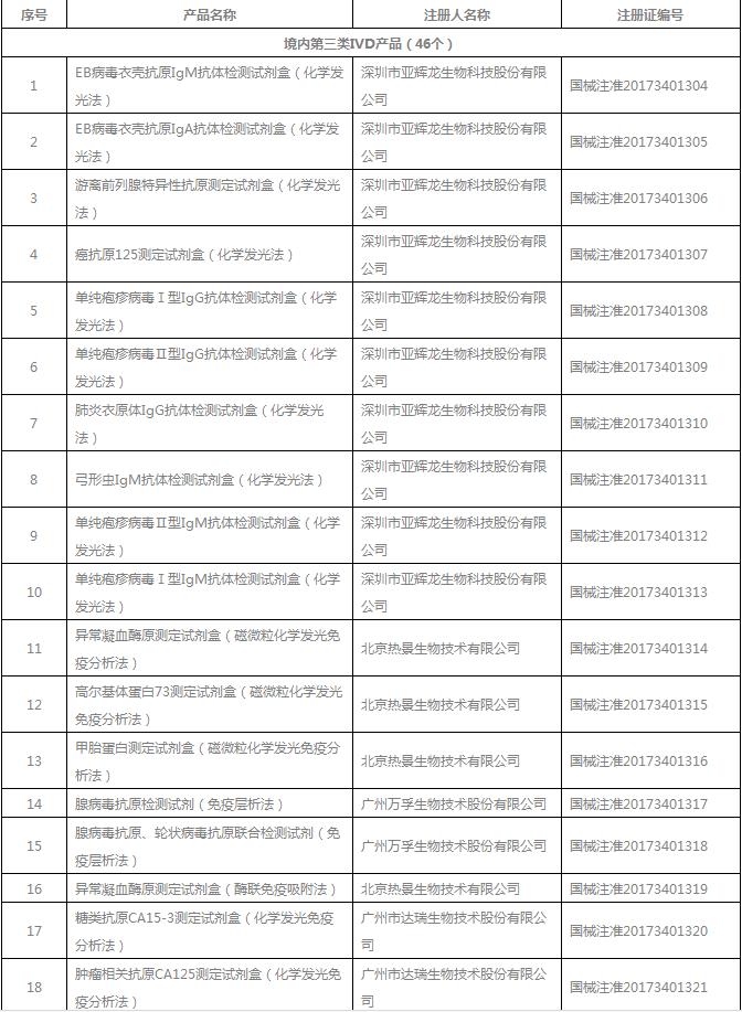 摘要: 2017年7月,国家食品药品监督管理总局共批准注册IVD产品共72个,包括境内第三类IVD产品46个,进口第三类IVD产品7个,进口第二类IVD产品19个。序号产品名称注册人名称注册证编号境内第三类IVD产品(46个)1EB病毒衣壳 ...