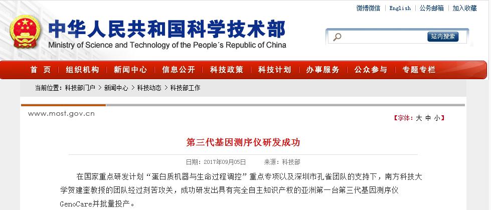 科技部最新消息,在国家重点研发计划“蛋白质机器与生命过程调控”重点专项以及深圳市孔雀团队的支持下,经过南方科技大学教授兼瀚海基因创始人贺建奎及其团队的攻关,成功研发出具有完全自主知识产权的亚洲第一台第三代基因测序仪GenoCare。