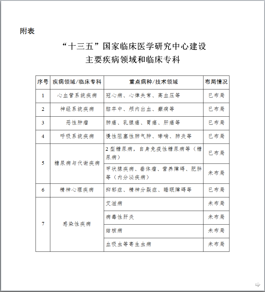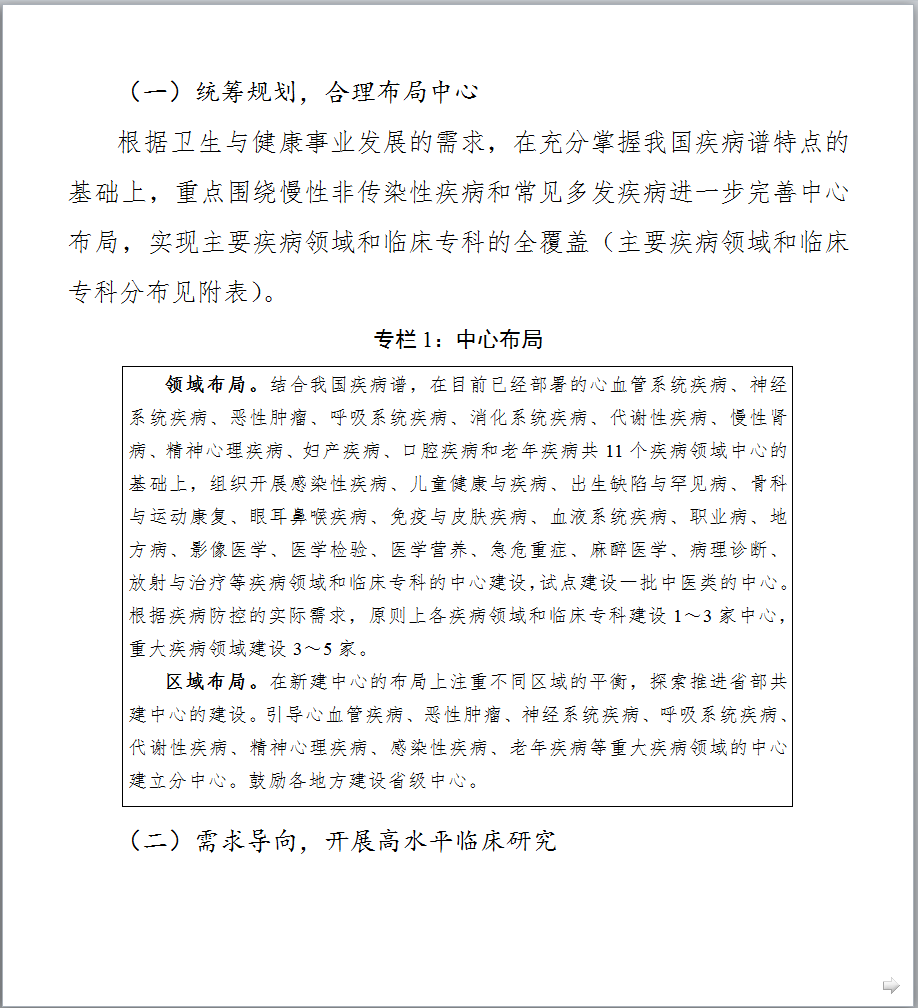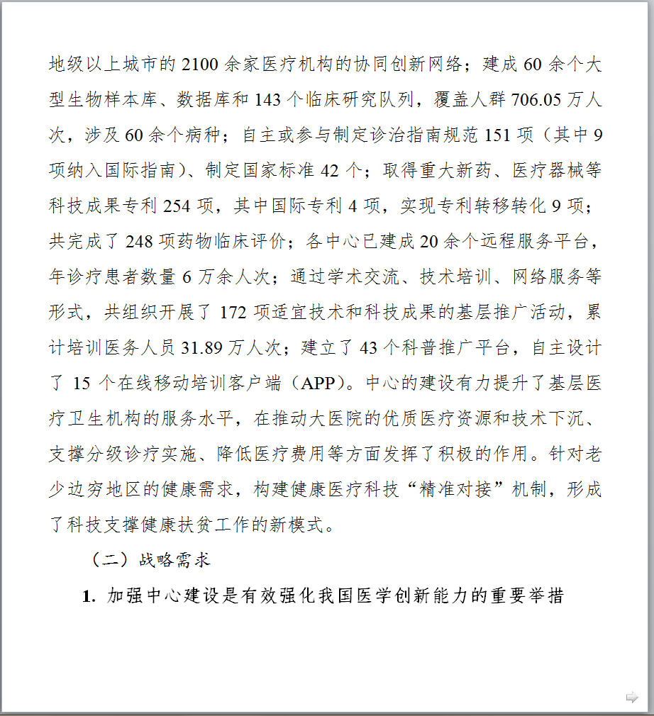 图片来源:科技部官网 最新发布的《文件一》提出,到2021年底,针对重大需求,在主要疾病领域和临床专科统筹建成100家左右的中心,引导建设分中心,针对区域特有重大疾病建设省部共建中心,鼓励各地方开展省级中心的建设,完善领域与区域布局;形成布局合理、定位清晰、管理科学、运行高效、开放共享、协同发展的国家临床医学研究创新体系,有效提升临床诊疗水平,推动医疗质量均质化,带动整体医疗水平的提高,促进健康产业的发展。 以下是《国家临床医学研究中心五年(2017-2021年)发展规划》全文,点击【科技部官网】查看所有文件详情。