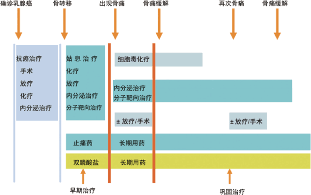 乳腺癌骨转移综合治疗的主要目标:①缓解疼痛,恢复功能,改善生活质量;②预防和治疗SRE;③控制肿瘤进展,延长患者生存期。