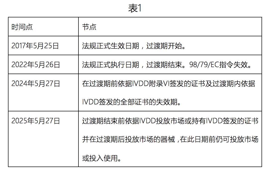 在过渡期结束(2022年5月26日)之前,根据IVDD 投放市场的器械及自2022年5月26日起投放市场并具有证书的器械在2025年5月27日之前可继续投放市场或投入使用。