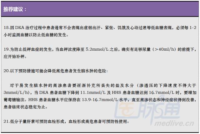 近30年来,我国糖尿病患病率显著增加,最近10年糖尿病流行情况更为严重。作为糖尿病急性并发症,包括糖尿病酮症酸中毒(DKA)及高血糖高渗综合征(HHS)在内的高血糖危象临床危害不可忽视,这两种病症均显著增加脑水肿、永久性神经损害和死亡等发生可能。 诱因 高血糖危象的主要诱因有胰岛素治疗不当和感染,其他诱因包括急性胰腺炎、心肌梗死、脑血管意外,诱发高血糖危象的药物包括糖皮质激素、噻嗪类利尿剂、拟交感神经药物及第二代抗精神病药。DKA和HHS主要诱因如下: 高血糖危象的诊断 1型甚至2型糖尿病患者的DKA常呈急性发病,发病很快;而HHS发病缓慢,历经数日或数周。DKA和HHS的临床表现可有:多尿、多饮、多食、体重减轻、呕吐、腹痛(仅DKA)、脱水、虚弱无力、意识模糊,最终陷入昏迷。尽管感染是DKA和HHS的常见诱因,但早期外周血管舒张,患者体温可以正常,甚至低体温。如有低体温是预后不良的标志。DKA和HHS的主要诊断标准如下: 鉴别诊断 鉴别诊断包括:①糖尿病酮症:在DKA发展过程中当患者对酸碱平衡处于代偿阶段,可以仅表现为酮症。诊断标准为血酮≥3mmol/L或尿酮体阳性,血糖>13.9mmol/L或已知为糖尿病患者,血清HCO3->18mmol/L和/或动脉血PH>7.3;②其他类型糖尿病昏迷:低血糖昏迷、高血糖高渗状态、乳酸性酸中毒;③其他疾病所致的昏迷:脑膜炎、尿毒症、脑血管意外等。高血糖危象DKA与HHS的鉴别如下: 高血糖危象的治疗 DKA与HHS的治疗原则为:尽快补液以恢复血容量、纠正失水状态,降低血糖,纠正电解质及酸碱平衡失调,同时积极寻找和消除诱因,防治并发症,降低病死率。主要治疗方法包括:补液、胰岛素、补钾、补碱及磷酸盐治疗。 补液治疗 胰岛素治疗 补钾治疗 补碱治疗 磷酸盐治疗 高血糖危象并发症的治疗 高血糖危象的预防 此新闻来源于搜狗微信养生堂 |
