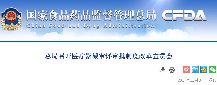 2017年11月9日,国家食品药品监督管理总局在上海召开全国医疗器械审评审批制度改革宣贯会。宣传贯彻中办国办《关于深化审评审批制度改革鼓励药品医疗器械创新的意见》,对意见内容进行解读,统一思想,上下联动,全力推动医疗器械审评审批制度改革进一步深化。总局副局长焦红出席并讲话。