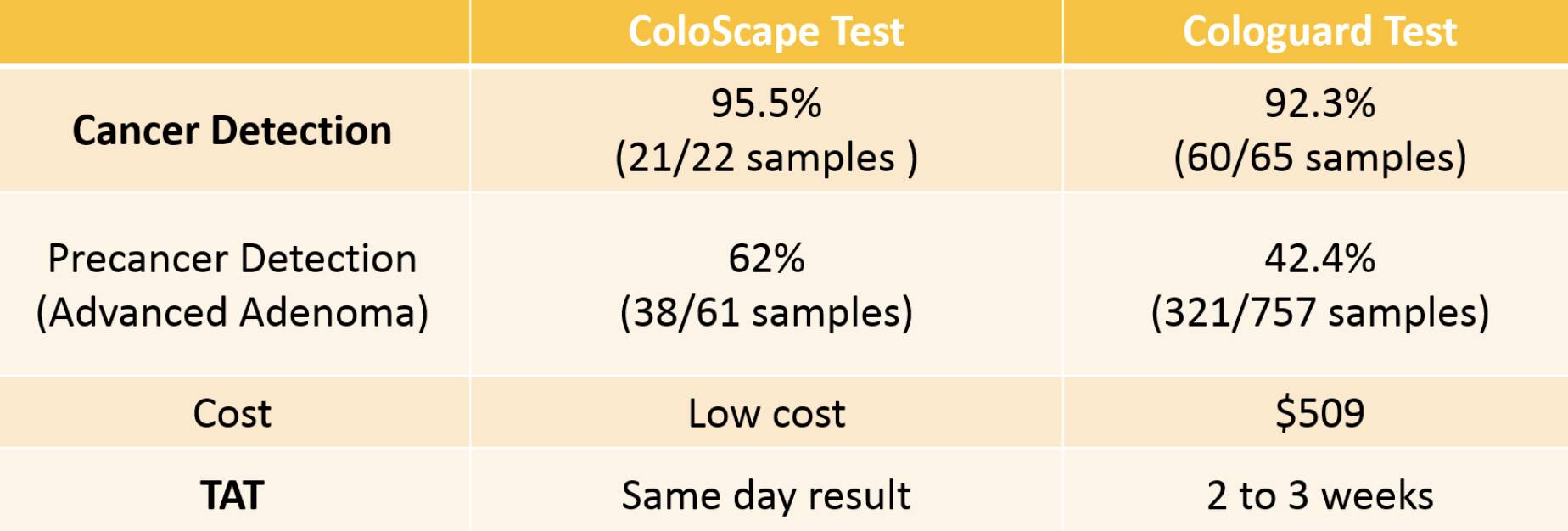 相较于从血液所有DNA片段中富集ctDNA,XNA技术通过抑制正常DNA片段的复制,达到只放大ctDNA的目的,显然是从另一个角度思考问题。「这个技术是一个反向思维,任何一个技术突破墨守成规是很难得到突破的。」张爱国博士在2016年奇点全球创新医疗大会上说。 显然,XNA本身不是用来发现新的基因突变,而是如果某个突变点有临床意义了,研究人员就可以根据这个位点设计XNA,做成诊断试剂盒。当然,如果需要监测多个基因的多个位点,只需要多设计几个XNA就好了,目前研究人员已经可以实现同时完成上百个位点的检测。用XNA去掉血浆DNA中的「草」之后,接下来做qPCR或者NGS都可以。 据了解,帝基生物团队已经给所有有临床意义的突变位点都设计了合适的XNA,并申报了专利。 目前,基于QClamp XNA技术的多个产品已经开始临床研究及运用了。其中检测肠癌的产品叫ColoScape,初步的临床研究结果已经出炉并已经获得欧盟论证(CE-IVD), 在欧洲及其它新兴国家开始推广。在与获得FDA批准的检测产品Cologuard(美国Exact Sciences公司))较量中,帝基生物的ColoScape表现明显优于Cologuard。尤其是在早期肠癌的筛查上。
