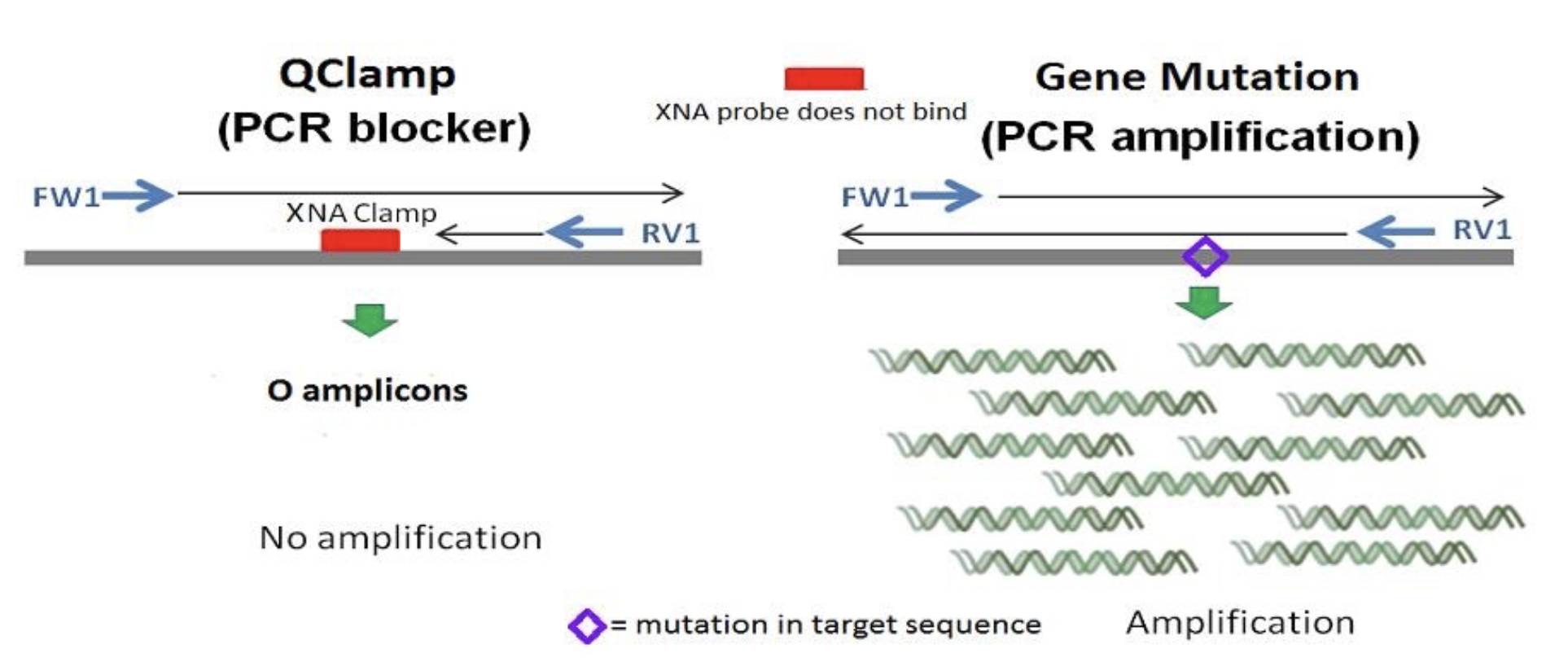 XNA实际上跟DNA和RNA差不多(4),简单地说,就是在DNA上加点化学基团,或者去掉一些化学基团,又或者更换一些化学基团。这些改变上看上去很小,但是对它们的化学性质却产生了巨大的影响。 「我们闭关的那段时间里,我们一直在做一件事,就是把组成DNA的一个核酸上的一个化学结构替换了(5)。」张爱国博士说,「这个结构的变化,导至DNA熔点的剧烈变化,一旦结合到不携带特定基因突变的DNA片段,就很难让它们分开了。这样一来,就把所有的没有特定突变的基因全部都除掉了,目前市场上的技术(包括PNA)都不能达到完全抑制干扰的效果。这就是个革命性的突破。」 实际上,帝基生物的QClamp XNA设计思想并不复杂, 因为XNA的主要任务是阻止没有突变的DNA片段复制,因此,他们就针对目前已经有临床意义的突变位点设计XNA。相对于突变位点而言,XNA只与没有发生突变的位点结合,而且这种结合可以用「不可逆」来形容,一旦结合上去,没有突变的DNA片段就被「锁住了」,就不能复制了,只有携带突变位点的ctDNA片段可以复制。 XNA的富集ctDNA的机制 当然,要把QClamp XNA做到完美并且能和成千上百个PCR探针组结合运用而不相互干扰并非一件容易的事。具张博士透露,市面上有些同行试图效仿他们的技术,但都没有什么好的结果,只好又过来和他们谈合作。