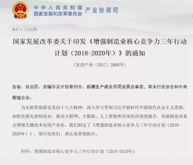 国家发改委11月27日发布关于印发《增强制造业核心竞争力三年行动计划(2018-2020年)》的通知)》(下文简称“《行动计划》”)。