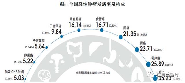 近年来,全国癌症发病形势严峻,发病率与死亡率呈持续上升趋势。《2014中国肿瘤登记年报》显示,根据对全国肿瘤登记中心2010 年监测数据分析可得, 2010 年全国估计新发恶性肿瘤病例约309 万,死亡病例196 万。全国恶性肿瘤发病率为235.23/10 万(男性268.65/10 万,女性200.21/10 万),中国人口标化率(中标率)184.58/10 万。全国恶性肿瘤死亡率为148.81/10 万(男性186.37/10万,女性109.42/10 万),中标率113.92/10 万。其中,城市中标死亡率109.21/10万,农村中标死亡率119.00/10 万。按照平均寿命74 岁计算,人一生中患恶性肿瘤的几率是22%,肿瘤已经成为一种常见疾病。