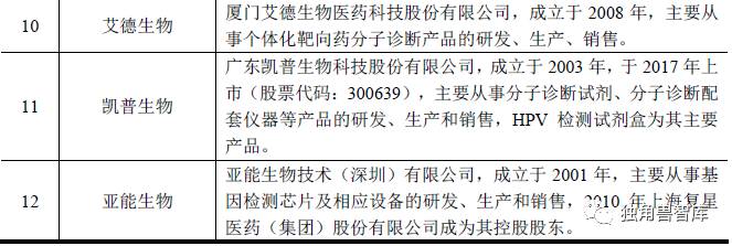 公司肿瘤标志物系列产品的主要竞争对手为外资品牌,如罗氏、雅培等,国内企业在该领域起步较晚,规模普遍较小,主要市场参与者为深圳新产业、安图生物等公司;公司HPV系列产品的主要竞争对手为国内企业,如凯普生物、亚能生物等。国内体外诊断行业主要企业还包括科华生物、达安基因、利德曼、艾德生物、九强生物、迈克生物、中生北控、美康生物等企业,上述企业的基本情况如下: 1、透景竞争地位