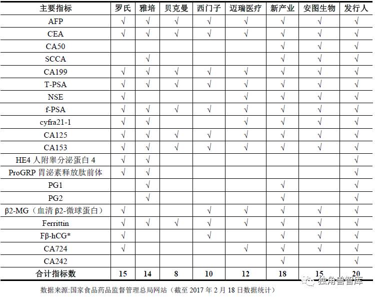 肿瘤标志物系列产品是公司目前主要产品,目前,公司已开发20种肿瘤标志物检测产品及对应的质控品和校准品,是国内乃至国际上肿瘤标志物临床检测产品最齐全的公司之一。公司肿瘤标志物产品在市场上具有良好的品牌影响力和市场竞争力,目前主要竞争对手为罗氏、雅培、贝克曼、西门子等外资品牌,及少数国内厂家如深圳新产业、安图生物等。目前,主要厂商肿瘤标志物产品检测指标情况如下: (2)公司高端医院覆盖率高,市场认可度高