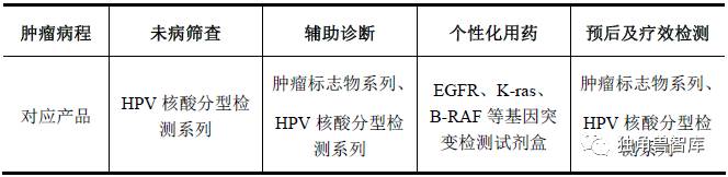 公司应用多种技术平台,已成功开发了20 种肿瘤标志物的临床检测产品及HPV 核酸分型检测系列产品,并获得了个性化用药相关检测产品,逐步布局肿瘤“未病筛查-辅助诊断-个性化用药-预后及疗效检测”全病程的各个环节,在国内肿瘤检测领域处于领先地位,具有良好的品牌效应和市场竞争力。公司产品在肿瘤检测各环节的应用情况如下: 公司将产品直接或间接销售到终端客户,客户根据自身需求将产品应用到肿瘤全病程的不同环节。其中,HPV核酸分型检测系列可以应用在未病筛查、辅助诊断、预后及疗效检测等环节;