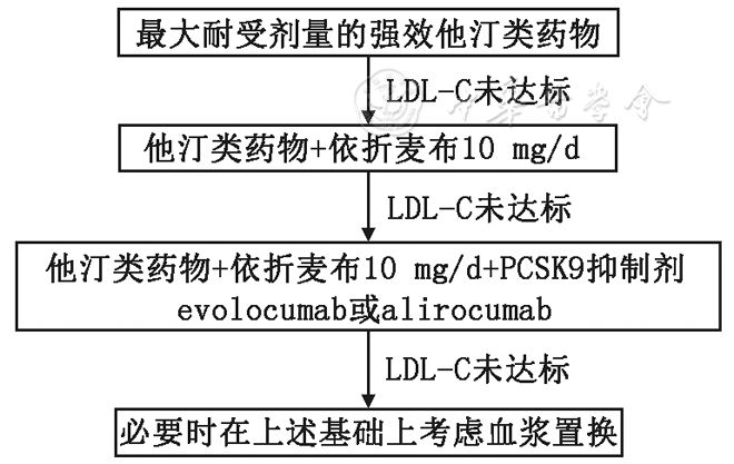 注:DLCN为荷兰临床脂质网络标准;分值>8分为确诊家族性高胆固醇血症(FH)、6~8分为FH可能性大,3~5分为可能的FH;LDL-C为低密度脂蛋白胆固醇,LDLR为低密度脂蛋白受体,Apo B为载脂蛋白B 筛查与诊断 早期筛查和诊断是降低FH患者ASCVD发病风险,改善临床预后的重要举措。 (一)筛查流程和内容 筛查可分为针对所有人群的普遍筛查和局限于某些重点人群的选择性筛查,本共识建议采用后者。根据我国人群血清胆固醇水平的特点以及FH的临床表现,为确定FH可疑人群,促进FH患者早期诊断和早期治疗,建议符合下列任意1项者要进入FH的筛查流程:(1)早发ASCVD(男性<55岁或女性<65岁即发生ASCVD);(2)成人血清LDL-C≥3.8 mmol/L(146.7 mg/dl),儿童血清LDL-C≥2.9 mmol/L(112.7 mg/dl),且能除外继发性高脂血症者;(3)有皮肤/腱黄素瘤或脂性角膜弓(<45岁);(4)一级亲属中有上述3种情况。 筛查需要完成以下内容:(1)家族史:询问早发ASCVD及FH家族史,家族成员(特别是一级亲属)的血清LDL-C水平,以及是否存在黄素瘤和脂性角膜弓等FH特征性的临床表现。(2)临床病史:是否为早发ASCVD患者,除关注冠心病的发病外,不要忽略卒中和外周动脉粥样硬化病史;同时要询问是否存在可使LDL-C水平继发增高的疾病,例如甲状腺功能减低、肾病综合征以及某些药物等,特别要注意除外和FH临床表型相似性较大的谷固醇血症。(3)体格检查:除规范的全身查体外,要特别关注有无黄色瘤和脂性角膜弓。对存在跟腱黄素瘤,或脂性角膜弓(<45岁)的患者要高度怀疑FH。(4)检测血清LDL-C水平:是筛查的必检项目。虽然基因检测是FH诊断的金标准,但无论基因突变检查有无异常发现,对可疑人群均需进行血LDL-C水平检测。 本共识建议一旦发现FH患者,应尽可能开展针对FH患者一级亲属的级联式筛查(cascade screening)。级联式筛查是效价比较高的FH筛查方式,新英格兰在过去20年内通过这种方式至少发现了27 000例FH患者,中国既往FH的级联筛查也效果显著。 (二)诊断标准 根据中国人群血LDL-C水平和FH的特点,并借鉴国外的经验,本共识建议成人符合下列标准中的2项即可诊断为FH:(1)未接受调脂药物治疗的患者血清LDL-C水平≥4.7 mmol/L(180 mg/dl);(2)有皮肤/腱黄色瘤或<45岁的人存在脂性角膜弓;(3)一级亲属中有FH或早发ASCVD,特别是冠心病患者。儿童FH的诊断标准:未治疗的血LDL-C水平≥3.6 mmol/L(140 mg/dl)且一级亲属中有FH患者或早发冠心病患者。 对于LDLR、Apo B、PCSK9和LDLRAP1基因检测到致病突变者也可诊断为FH。FH的筛查与临床诊断流程见图1。 ▲图1 FH的筛查与临床诊断流程 (三)鉴别诊断 在确诊FH前需要除外一些可能引起血LDL-C水平升高的疾病。 1.继发性高胆固醇血症: 甲状腺功能减退、肾病综合征等因素可出现继发性高胆固醇血症。 2.植物固醇血症: FH和植物固醇血症都以早发冠心病及全身黄色瘤为典型表现,植物固醇血症也是由基因突变所致,但二者的致病基因不同。通过血清植物固醇水平测定或基因检测可以鉴别。 治疗 ▲图2 家族性高胆固醇血症治疗流程 本文来源:选自《中华心血管病杂志》, 2018,46(2) : 99-103. | |||||||||||||||||||||||||||||||||||||||||||||||||||||||||