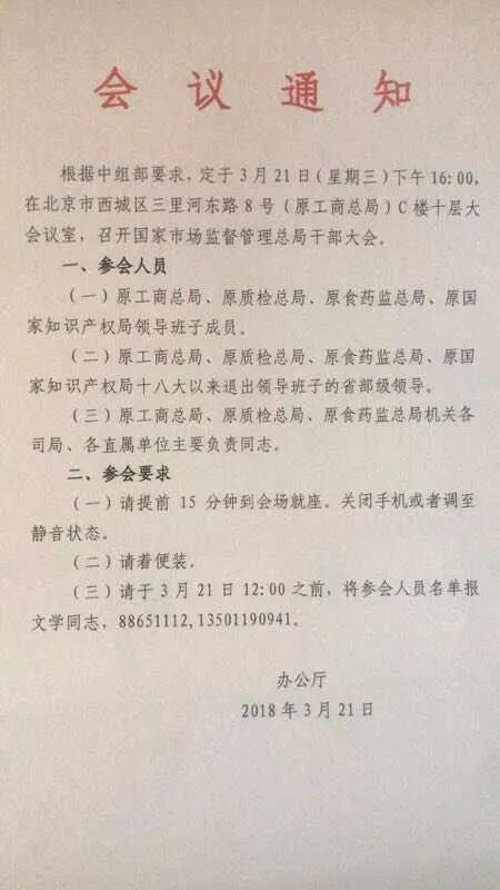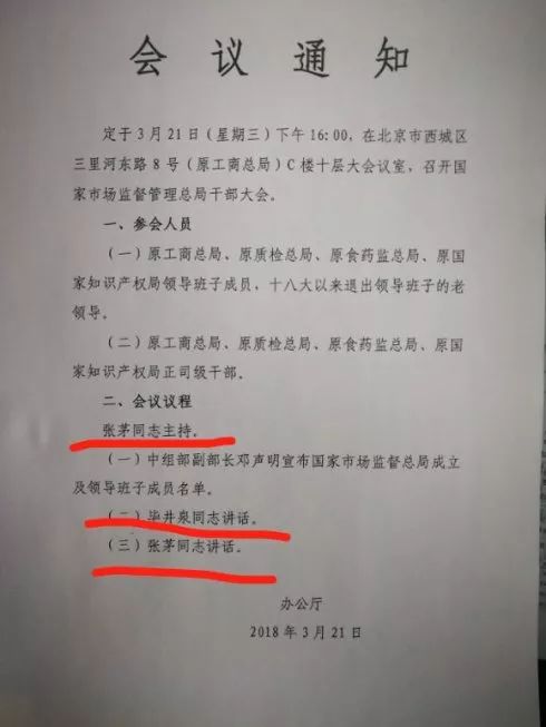 今天下午,国家市场监管总局正式成立,中组部副部长邓声明在国家市场监管总局干部大会上宣布:张茅任局长,毕井泉任党组书记。