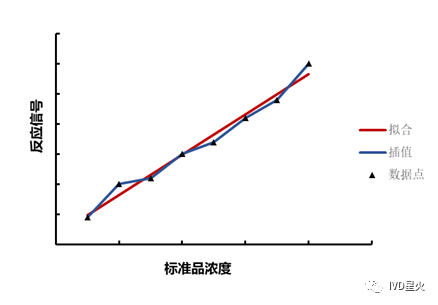 定量体外诊断试剂盒,测定未知样本待测物的浓度含量,是以系列浓度标准品测得剂量反应曲线,即得到标准曲线,再以此计算待测样本的浓度。 当我们得到一系列已知浓度标准品的反应后,就会去建立函数关系,数学上称曲线拟合,根据试剂反应信号趋势的不同会用到不同拟合方式。 反应中待测物质和免疫反应之间的关系一般不是简单的直线,这就存在系列浓度标准品与检测结果有多种曲线拟合方式。不同类型的试剂由于待测物不同、检测方法不同等,试剂反应信号趋势并不相同。建立标准曲线,选择合适的数学模型(函数),提高剂量反应曲线绘制的准确度,从而获得较为精确的待测物浓度结果。一般单纯的线性回归不能说明真实的免疫反应情况,因此标准曲线主要是非线性拟合。 一般采用差值法(内插法)或者曲线拟合的方式获得标准曲线。 差值法(Interpolation Method):用函数f (x)在某区间中已知的若干点的函数值,作出适当的特定函数,在区间的其他点上用这特定函数的值作为函数f (x)的近似值。该方法以假定数据正确为前提,要求以某种方法描述数据点之间所发生关系或规律。即插值是找到一个或几个分片光滑的连续曲面来穿过这些点。 曲线拟合(Curve Fitting):用连续曲线近似地刻画或比拟平面上离散数据点所表示的坐标之间的函数关系的一种数据处理方法。将测得许多离散的实验数据(比如标准品浓度与测定信号值),寻找一条连续光滑曲线来近似反映已知数据组间存在的某种关系的一般趋势,所得近似函数f(x)可以很好地逼近离散数据,这个函数逼近的过程称为曲线拟合。这条光滑曲线,能最佳地拟合数据,通常不必要经过所有数据点,甚至可能不经过任何数据点,曲线拟合公式反映的是数据点整体的变化趋势。 拟合与差值的比较 运算过程上的区别: 拟合:将数据点用最恰当的曲线描述出来,反映问题的规律和趋势,是从特殊到一般。 插值:在知道曲线的形状后,得出某些具体点的性质的过程,是从一般到特殊。 求解误差上的区别: 拟合:在误差不可避免时考虑观察点的误差,以偏差的某种最小为拟合标准。 插值:在观测点处无误差。 常用的数学函数举例 一、插值法: 插值法又可分为线性插值法和样条插值法。 1. 线性插值法(Linear interpolation): 线性插值法是指使用连接两个已知量的直线来确定在这两个已知量之间的一个未知量的值的方法。 最简单的例子:假设我们已知坐标(x0,y0)与(x1,y1),要得到[x0,x1]区间内某一位置x在直线上的值。根据图中所示,我们得到两点式直线方程: