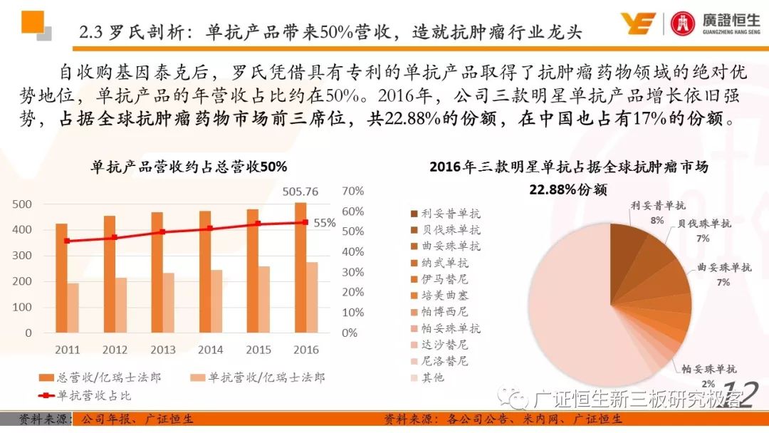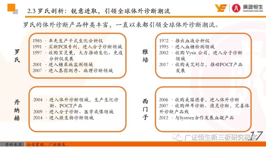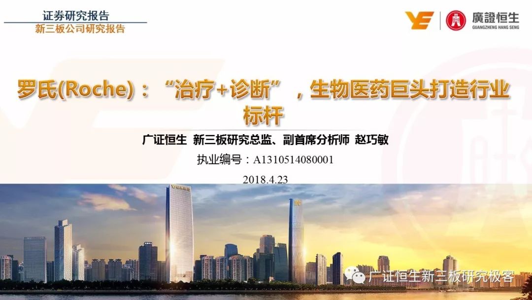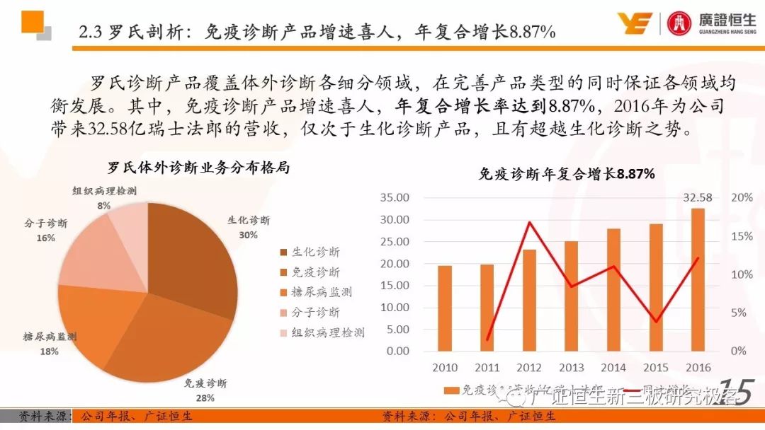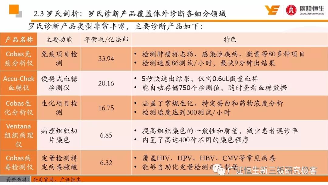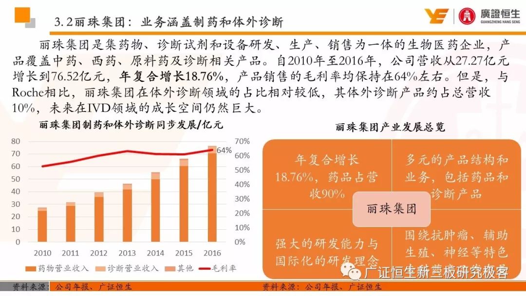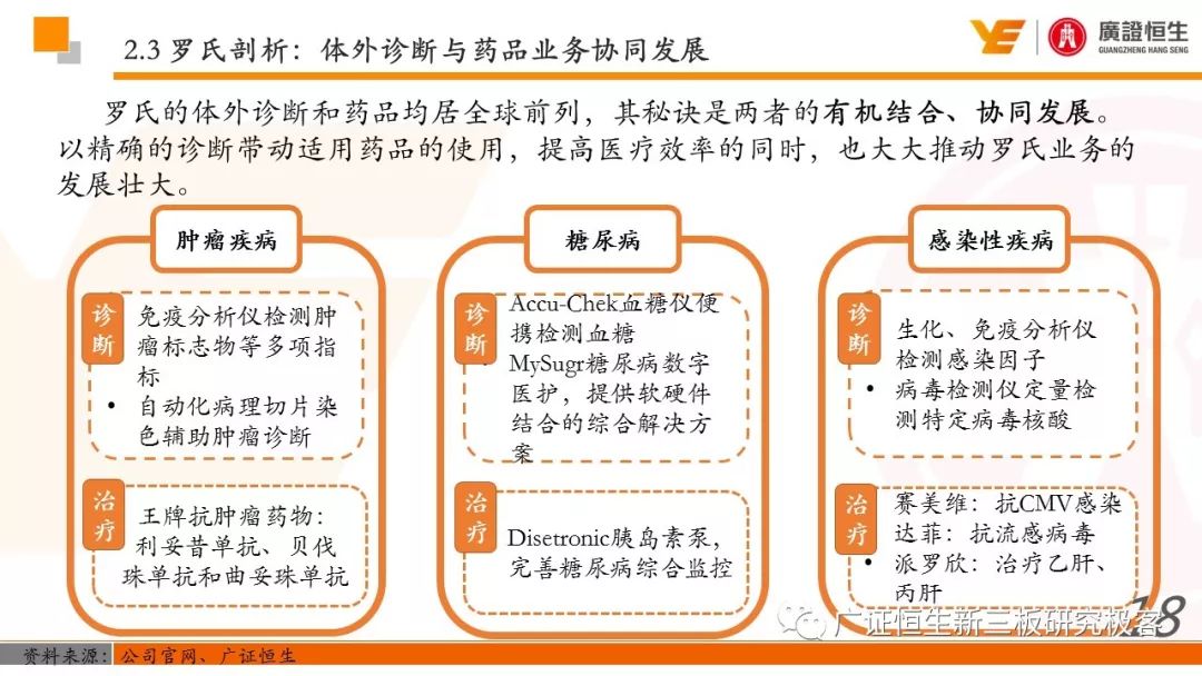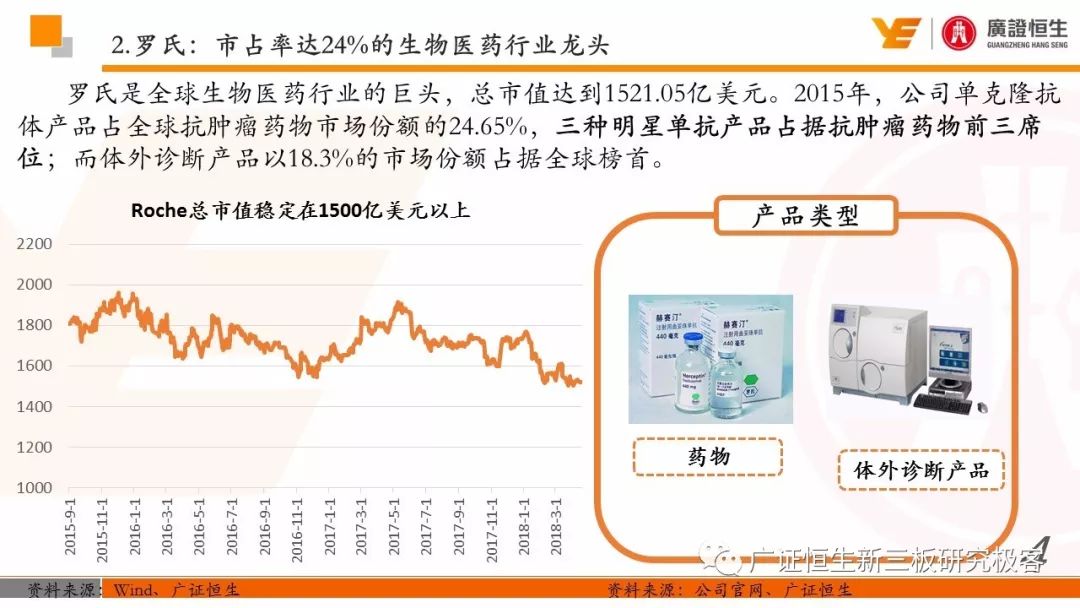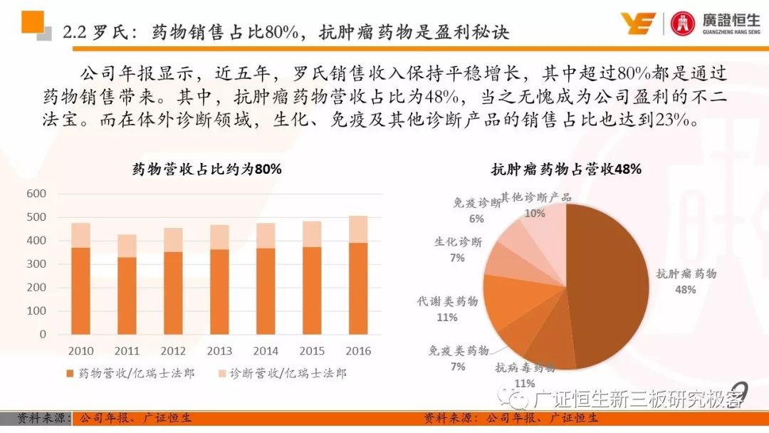 3.以精确诊断指导药品的使用,制药和诊断业务有机结合、协同发展的模式是Roche发展壮大的关键。由于我国抗体药及体外诊断两大行业均还处于发展早期,国内仅仅有丽珠集团等少数企业同时布局这两块业务。 一、全球医药行业市场规模已达10762亿美元 由于仿制药的不断涌现及新兴市场国家经济快速发展造成对需求的增加,2011至2016年,全球医药行业的市场规模从8331亿美元稳定增长至10762亿美元,年复合增长率为5.25%。 二、罗氏:市占率达24%的生物医药行业龙头 罗氏是全球生物医药行业的巨头,总市值达到1521.05亿美元。2015年,公司单克隆抗体产品占全球抗肿瘤药物市场份额的24.65%,三种明星单抗产品占据抗肿瘤药物前三席位;体外诊断产品占全球市场份额的18.3%,在全球抗肿瘤和体外诊断领域均占据优势地位,其客户遍布全球各大医疗机构、科研院所、生物技术及其他主要机构。 自2006年到2016年,罗氏保持稳定增长,营业收入从435.07亿瑞士法郎增长至526.36亿瑞士法郎,归母净利润每年均保持在90亿瑞士法郎左右。同时,公司作为生物医药行业的龙头,毛利率一直保持在70%以上。 罗氏于1896年成立,成立初期主要生产专业处方药、植物生物碱提取药物等。自1980年以来,公司收购了十余家生物科技企业并推出了一系列新药及体外诊断产品。 1968年,公司设立诊断部门,正式进军体外诊断领域;1990年,公司收购基因泰克并在1997年收购宝灵曼,推动公司成为体外诊断领域的先导者;同年,公司推出重磅抗肿瘤药物利妥昔单抗和曲妥珠单抗,开启罗氏抗肿瘤药物龙头地位;2003年,收购胰岛素泵生产商Disetronic,配合公司的便携式血糖仪使公司成为糖尿病监控领域领先者;2007年,通过收购Life Science,进入基因测序领域,开启了新的体外诊断篇章。 公司年报显示,近五年,罗氏销售收入保持平稳增长,其中超过80%都是通过药物销售带来。其中,抗肿瘤药物营收占比为48%,当之无愧成为公司盈利的不二法宝。而在体外诊断领域,生化、免疫诊断产品的销售占比也达到13%。 近年来,罗氏的业务仍然以欧美市场为主。其中,药物在欧美地区的营收占比超过66%。而体外诊断产品在欧美的销售占比也达到65%。相比其他地区的缓慢增长步伐,以中国为代表的亚太地区的体外诊断业务增长非常迅速,从2011年的12.66亿瑞士法郎增长到2016年的23.50亿瑞士法郎,年复合增长率为达到13.17%,冠绝全球。 罗氏生产的药物品种繁多,能够覆盖8大类疾病,包括肿瘤疾病、感染性疾病、心血管疾病及代谢紊乱等多种类常见病,其中,利妥昔单抗、曲妥珠单抗和贝伐珠单抗是其销量最高的三种药物。 自收购基因泰克后,罗氏凭借具有专利的单抗产品取得了抗肿瘤药物领域的绝对优势地位,单抗产品的年营收占比约在50%。2016年,公司三款明星单抗产品增长依旧强势,占据全球抗肿瘤药物市场前三席位,共22.88%的份额,在中国也占有17%的份额。 2016年,三款明星单抗产品共为公司带来227.11亿瑞士法郎的收入,占公司总营收的44.9%。其中,靶向治疗淋巴瘤的利妥昔单抗凭借73亿瑞士法郎的营收占据全球前五的席位,而贝伐珠单抗和曲妥珠单抗则分列在第七、第八位。 自1968年设立体外诊断部门以来,罗氏不断推出多款具有创造性地体外诊断试剂及仪器,覆盖生化、免疫、分子及POCT等多个诊断细分领域,体外诊断产品也为罗氏带来22%的营收。2015年,罗氏以18.3%的市场份额雄踞全球体外诊断榜首。 罗氏诊断产品覆盖体外诊断各细分领域,在完善产品类型的同时保证各领域均衡发展。其中,免疫诊断产品增速喜人,年复合增长率达到8.87%,2016年为公司带来32.58亿瑞士法郎的营收,仅次于生化诊断产品,且有超越生化诊断之势。 罗氏的体外诊断产品种类丰富,一直以来都引领全球体外诊断潮流。 罗氏的体外诊断和药品均居全球前列,其秘诀是两者的有机结合、协同发展。以精确的诊断带动适用药品的使用,提高医疗效率的同时,也大大推动罗氏业务的发展壮大。 强大的研发创新能力使得罗氏一直保持生物医药龙头的地位,也是推动公司不断发展的源动力。总量上,公司每年研发投入非常巨大,同时研发占营收比例也大大高于同行业的雅培和丹纳赫公司,保持在20%左右。 药品的研发是生物医药公司生存的命脉,对于罗氏也不例外。2016年,公司不断加大药物研发的投入,加快研发的进程。全年,共有3种新药进入注册阶段,39种新研发药物进入一期临床试验,其中超过半数为抗肿瘤药物。 三、罗氏推动中国生物医药事业发展 罗氏早在1926年就在中国设立了子公司,2009年,中国成为公司在全球设立的五个药品开发中心之一。世界巨头罗氏进驻中国,为国内患者的诊断和治疗带来了更多的解决方案,大大促进了国内生物医药事业的发展。 四、丽珠集团:业务涵盖制药和体外诊断 丽珠集团是集药物、诊断试剂和设备研发、生产、销售为一体的生物医药企业,产品覆盖中药、西药、原料药及诊断相关产品。自2010年至2016年,公司营收从27.27亿元增长到76.52亿元,年复合增长18.76%,产品销售的毛利率均保持在64%左右。近年来,其体外诊断产品约占总营收10%,未来发展空间不可小觑。 |
