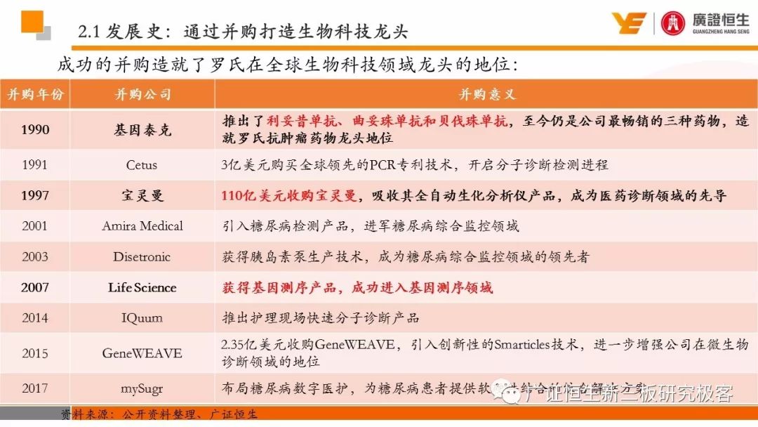 2. 三大明星单抗以及化学发光诊断产品等不断推出的重磅产品是公司行业领先地位的保证,而“并购+自研”是公司新产品的两大来源:并购宝灵曼、基因泰克铸就了诊断与抗体药物的基础,而每年20%的研发费用远超同行。