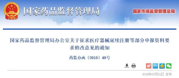 5月21日,国家药品监督管理局办公室发布关于征求医疗器械延续注册等部分申报资料要求修改意见的通知。