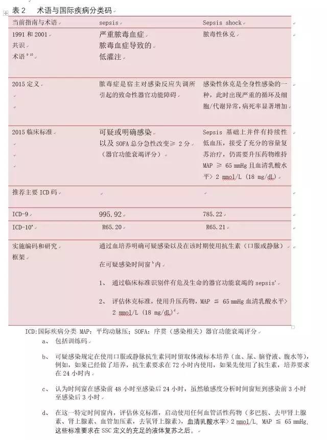 根据准确应用诊断编码的重要性的要求,表2列举了脓毒症与感染性休克新的临床诊断标准与ICD-9-CM及ICD-10编码的相关性。工作组还支持近期发表的通俗定义,即“脓毒症是一种由感染引发的机体反应对机体组织和器官本身造成损害而导至的致命性疾病”,这一概念与上述最新提出的定义相符。为向普通大众宣传脓毒症的重要性,工作组强调脓毒症可能导至死亡,尤其当未能及时发现和治疗时。事实上,尽管在疫苗、抗生素以及急性病治疗等方面取得了长足进步,脓毒症染仍然是感染导至患者死亡的主要原因。建议采取更加广泛的教育行动以帮助公众更好的了解这一致命性疾病。对于定义脓毒症 和感染性休克本身就有挑战,首先,脓毒症是一个广义的术语,用于描述一个尚未完全认知的进程,到目前为止,还没有简单和清楚的临床标准或生物、影像、或实验室特征可以独一无二的识别一个脓毒血症患者。工作组认识到不可能达到全部的共识,实用的折中方案还是需要的,所以要把重点放在诊断标准的普遍性和寻找容易测量的标识上,这些标识能最好能体现脓毒症当前根本机制的构想。然后工作组进行18个月的评议,这一过程以详细的数据作为指导,以及由专业机构进行同行审议,探询多个领域讨论的认可。明确这些问题对诊断标准的制定大有帮助,保证了最后所采纳意见的公正性。s脓毒症的新定义体现了一个最新的病理生理学观点,尤其是考虑了如何区分脓毒症与无并发症的感染。工作组也提供了一个简单可测量的的脓毒症临床诊断标准,这一标准能诠释脓毒症的本质并进行客观记录(见图)。虽然这些标准不能包括全部,但它们易于使用,为临床医生,研究者、管理人员以及资助者提供了一致的术语。SOFA评分所需要的生理和生化试验经常包括在病人的常规检查中,而且得分可以回顾获得。一开始,回顾性分析提示qSOFA可能是一个有用的临床工具,能快速的区分可能会恶化的感染患者,尤其是对于内科医生和在非ICU医务人员(甚至可能在医院外,依赖临床检查结果给出qSOFA评分),然而,由于大部分数据来源于美国的数据库,工作组强烈鼓励在美国多家医院和非美国医疗机构进行前瞻性验证研究,以确认其稳健性和纳入下次定义的潜在可能性。这个简易床边评分可能在那些实验数据不能迅速取得和脓毒症流行病学文献缺乏空白的的环 境中更加有意义。无论是qSOFA还是SOFA都不是被规定为脓毒症的独一定义,但是,很重要的一点是,患者qSOFA或SOFA评分不到2分不应该延迟对感染的观察和治疗,以及延误被医务人员认为必须关注的患者的任何方面治疗。qSOFA可以在床边快速评分而不需要抽血化验,希望它将帮助迅速识别会构成更大的威胁生命的感染。如果还没有开始进行合适的实验室检查,可能需要要进行生化检查以明确是否存在器官功能衰竭。这些数据将有助于患者的治疗,而且也能有利于接下来的SOFA评分。工作组希望强调SIRS标准可能对于识别感染仍然有效。有些人争论乳酸测定应该采纳为一个感染患者的重要的脓毒症生物学标记物,但是由于在一个qSOFA≥2 分,可能成为脓毒症的患者中,乳酸测定不能在预测效度提供有意义的变化,相比较简易床边评分标准,而乳酸测定增加了诊断的复杂性和医疗费用,工作组无法证明这一措施是正确的。工作组推荐不应该把乳酸测定捆绑为指导治疗有效性或疾病严重程度的预测指标。我们关于高乳酸血症在脓毒症休克临床诊断中的作用存在不同的观点。部分学者认为乳酸水平升高是提示非低血压性“隐性休克”的一个重要标志。另有一部分学者则表达对其特异性的担忧,担心由于血乳酸水平检测技术的不足可能妨碍脓毒症休克的诊断。目前仍没有完美的解决方案。乳酸是一个敏感的、非特异性的,独立的关于细胞或代谢应激的指标,而不是“休克”的指标。然而,高乳酸血症合并非低血容性低血压将预示高的死亡率。因此血乳酸可以为感染性休克的生理学改变及流行病学方面提供有力证据,而不仅仅用作诊断标准。脓毒症休克作为为一个独立疾病的重要性更多体现在流行病学方面,而不是临床方面。尽管高乳酸血症和低血压在临床上独立存在又密切相关,而推荐的标准与最近的其他共识不一致,临床上疾病的诊疗不能受其影响。大量数据分析对脓毒症休克发生率及其相关死亡率提供了更准确的数据。目前统计结果相差4倍。这个标准也许有助于从病理生理学方面研究脓毒症和脓毒症休克。在血乳酸水平监测不方便的情况下,通过低血压及其他支持组织缺氧的证据(如毛细血管充盈延迟)来诊断脓毒症休克是必要的。一直专注成年病人的工作小组,确认更新一些针对儿童人群的类似概念的必要性,意识到目前应用的临床标准需要考虑到与年龄相关的,在正常生理范围和病理生理反应的变化。工作组提出了新的定义,更新了包含了器官功能紊乱(方框3)在内的脓毒症生物学知识,然而,就像上面所说的,脓毒症休克与其他综合征状况类似,仍缺乏明确的诊断标准和排除标准,并且需要在各种可能的条件下进行评估。为了协助临床工作,在更准确的诊断标准没有确立的情况下,简易的临床评分(qSOFA)有助于辨别那些预后不良的疑似感染患者,因为这意味着长时间ICU住院甚至死亡。 这种方法具有重要的流行病和研究的价值。拟议的标准应该帮