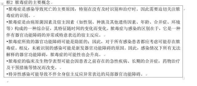 重要性:脓毒症与感染性休克的定义最后一次修订是在2001年。考虑到脓毒症病理学(器官功能、形态学、细胞生物学、生物化学、免疫学以及循环的变化)、管理以及流行病方面已经取得的进展,因此需要对该定义进行复审。目的:根据需要对脓毒症与感染性休克的定义进行更新和评估过程:危重病医学学会与欧洲重症监护医学学会召集19名脓毒症病理学、临床试验以及流行病学方面的专家组成工作组。脓毒症及感染性休克的定义与临床诊断标准通过会议、Delphi程序、电子健康记录数据库分析、以及投票产生,然后送至国际专业协会,要求(在致谢中列出的31个协会)同行进行评审与认可。以前的定义的局限性包括过度关注炎症反应、认为脓毒症遵循一个从严重脓毒症发展至休克的连续性误导模式、全身炎症反应综合征(SIRS)诊断标准的特异性与敏感性不足。目前已有多个术语用于脓毒症、感染性休克以及器官功能障碍的定义,导至在报告发生率与观察死亡率时出现差异。工作组得出结论:“严重脓毒症”这个术语是多余的。建议:脓毒症应该定义为感染引起的宿主反应失调所导至的致命性器官功能障碍。为了便于临床操作,器官功能障碍可以用序贯[全身感染相关]器官功能衰竭评分(SOFA)的增加大于等于2分来表示,其相关的住院死亡率大于10%。感染性休克应该被定义为脓毒症的一个类型,与单独的脓毒症相比,特别是在严重循环、分子、代谢异常方面与高死亡风险密切相关。在临床上感染性休克患者可通过下列情况加以识别:在排除低血容量的情况下,需应用升压药以维持平均动脉≥65mmHg,以及血清乳酸>2mmol/L(>18mg/dL)。感染性休克的患者在临床上可以通过下情况被识别:需要应用血管加压素保持平均动脉大于等于65mmHg,以及在没有低血容量情况下血乳酸大于2mmol/L(>18mg/dL)。根据这一联合标准,感染性休克的住院死亡率>40%。这个联合标准诊断的感染性休克患者相关的住院死亡率大于40%。在院外、急诊科或医院普通病房可疑感染的成人患者若符合至少2项临床标准[这一标准构成一新的床旁指标即快速SOFA(qSOFA):呼吸频率≥22次/分、意识状态改变、收缩压≤100mmHg],即可快速识别那些可能出现典型脓毒症不良预后的可疑感染的非ICU患者。在院外、急诊科以及医院普通病房,怀疑存在感染的成年患者,如果下面的临床诊断标准存在至少2条(这些诊断标准构成一个新的临床评分称作quickSOFA[qSOFA]:呼吸频率大于等于22次/min,意识改变,收缩压小于等于100mmHg),则作为更可能存在预后不良的典型脓毒症患者而被快速识别。结论和临床意义:这些更新的定义和临床诊断标准应该取代之前以前的定义,使流行病学研究和临床试验的结果与临床实际更加一致,便于快速识别和更及时地救治脓毒症患者或有可能进展为脓毒症风险的患者。脓毒症是一种由感染所导至的生理、病理和生物化学异常的综合征,是影响公众健康的重大问题。2011年来自美国的数据表明,超过200亿美元(美国医院临床费用的5.2%)用于了脓毒症的治疗。据报道脓毒症的发生率在持续增长,这可能反映了合并症较多的老年人口数量增加、更多的人认识到脓毒症的存在和一些国家的医保报销优惠政策等。尽管脓毒症真实的发病率仍然是未知数,保守的估计表明脓毒症是全球范围内患者死亡和危重疾病的一个主要病因。此外,人们越来越深刻的认识到存活的脓毒症患者往往会存在长期的生理、心理和认知障碍,带来巨大的医疗和社会问题。1991年的共识会议提出的脓毒症最初定义关注于当时流行的观点,认为脓毒症是由于感染引起宿主的全身炎症反应综合征(见方框1)。脓毒症合并器官功能障碍称为严重脓毒症,后者可以进展为感染性休克,感染性休克被定义为“由脓毒症所致,虽经充分液体复苏后仍无法逆转的持续低血压”。 2001年的工作组基于对这些定义的局限性的认识,拓展了诊断标准,但由于缺乏支持证据并未提出替代方案。实际上,脓毒症、感染性休克和器官功能障碍的定义在近20年中没有大的变化。由于对目前的定义需要重新审视,欧洲重症监护学会(ESICCM)和美国危重病医学会(SCCM)于2014年1月联合组成了一个包括重症监护室、感染科、外科和呼吸科专家在内的工作组。无用途限制的基金由两个学会提供,工作组保持了完全的自主性。两个学会各自任命了共同主席(Dr Deutschman和Singer),两位共同主席基于在脓毒症流行病学、临床试验和基础及应用研究上的科学专长选择工作组成员。工作组通过2014年1月到2015年1月之间举行的四次面对面会议、邮件往来和投票进行了反复讨论。工作组成员在基于对病理生理学认识的提高和可调用大型电子健康记录数据库及患者队列的前提下对脓毒症现行的定义进行了重新审视。基于目前对脓毒症所致的器官功能、形态学、细胞生物学、生物化学、免疫学和循环(总称病理生理学)的理解形成了脓毒症最新定义和诊断标准的专家共识,该诊断标准也将在临床中进行检验(内容效度)。下文也会对脓毒症的定义及不同诊断标准间的差异进行讨论。对潜在临床标准(建构效度)与该标准评价脓毒症预后(需要进入ICU进行治疗或死亡)能力(预测效度,一种标准效度)之间的一致性也进行了检测。工作组在多个大型电子健康记录数据库中进行了上述探索,这些数据库同时也解决了缺乏不同器
