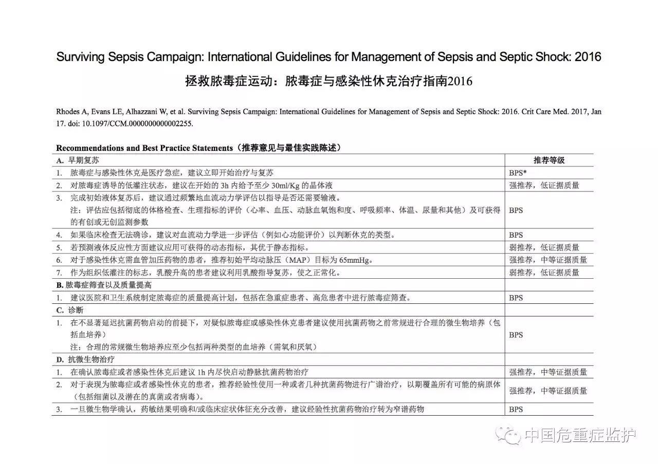 拯救脓毒症运动:脓毒症与感染性休克治疗指南2016