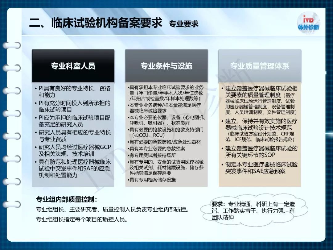 《备案办法》分为总则、备案条件、备案程序、监督管理和附则五章共二十条。 总体要求,明确了目的、定义和适用范围,适用于在我国境内开展医疗器械临床试验的临床试验机构备案。 备案条件,明确了医疗机构备案应当具备的条件等相关要求;为了加强对高风险医疗器械管理,保证受试者安全和提高临床试验质量,规定对列入需进行临床试验审批目录的第三类产品,应当在三级甲等医疗机构专业范围内开展临床试验;规定开展创新医疗器械产品或需进行临床试验审批的第三类医疗器械产品临床试验的主要研究者应具有高级技术职称并且参加过3个以上医疗器械或药物临床试验等等。 备案程序,由食品药品监管总局组织建立医疗器械临床试验机构备案管理信息系统(以下简称备案系统);医疗器械临床试验机构办理备案获得备案号后可以承担医疗器械临床试验。 监督管理,明确了省级以上食品药品监管部门和卫生计生行政部门按照分工负责组织开展对临床试验机构的监督管理和信息沟通等职责。