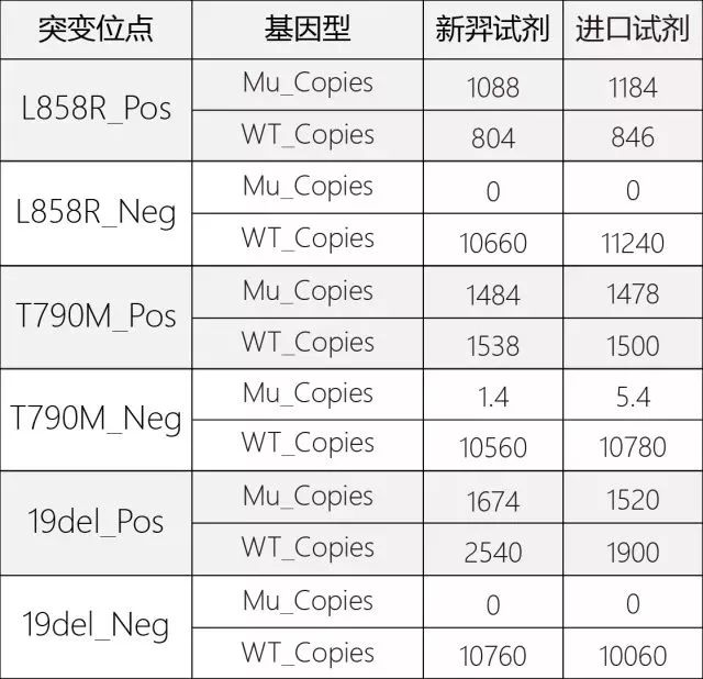 进口试剂 采用新羿生物试剂(包括扩增试剂、生成油、检测油)和进口商品化试剂对EGFR L858R、T790M、19del基因突变进行对比检测。独立第三方客户的对比结果显示:两者对阳性样本的定量结果基本一致,新羿生物试剂对于阴性样本的背景信号更稳定;新羿生物试剂的有效液滴数略高于进口试剂且比较稳定。