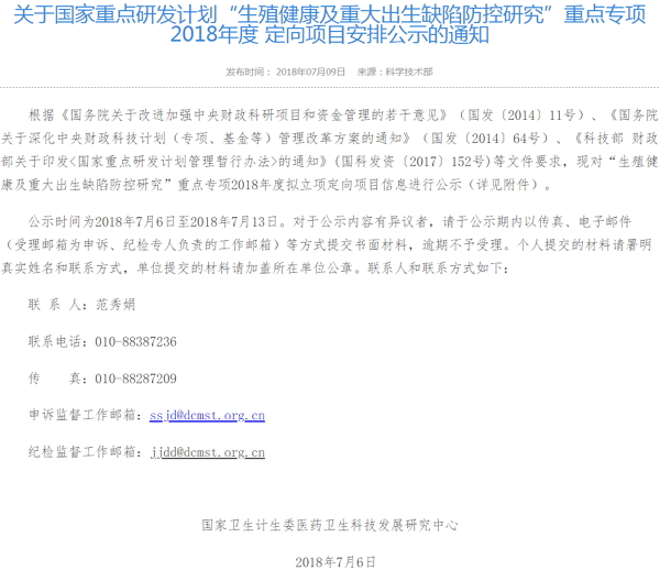 7月9日,科学技术部官网发布“生殖健康及重大出生缺陷防控研究”重点专项2018年度拟立项定向项目信息,共7个项目入围,获中央财政经费8449万元,实施周期为2018—2020年。具体如下表: