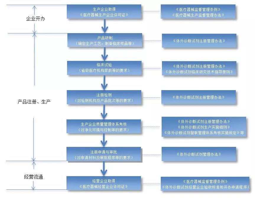 体外诊断试剂作为医疗器械类产品,关系到医疗诊治的准确性和安全性等一系列重大问题,丝毫马虎不得。因此,从各国经验来看,均要求体外诊断试剂类产品在研发、生产直到上市销售的整个环节中,遵守严格的法规规范要求(图1)。中国作为一个人口大国,理应在这方面做到更好更规范。