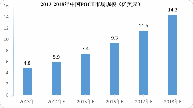 《Global Point-of-Care Diagnostics Market Outlook 2018》(Rncos)数据显示,2013 年我国 POCT 市场规模为 4.8 亿美元。随着医改的推进和对社区医疗体系的建立,我国 POCT 市场未来几年将保持 20%的年复合增长率,预计到 2018 年, 我国 POCT 市场规模可达 14.3 亿美元。