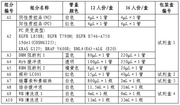 1. 适用范围:用于定性检测非小细胞肺癌(NSCLC)患者经福尔马林固定的石蜡包埋(FFPE)的组织标本中EGFR/ALK/BRAF/KRAS基因变异。其中,EGFR基因中:19号外显子缺失(19del)、L858R点突变用于吉非替尼、埃克替尼的伴随诊断检测,T790M点突变用于奥希替尼的伴随诊断检测;ALK基因中:ALK重排(融合)用于克唑替尼的伴随诊断检测,其它稀有突变本产品检测试剂可以检出,但EGFR/ALK/BRAF/KRAS相关肿瘤药物安全性和有效性尚未确定。