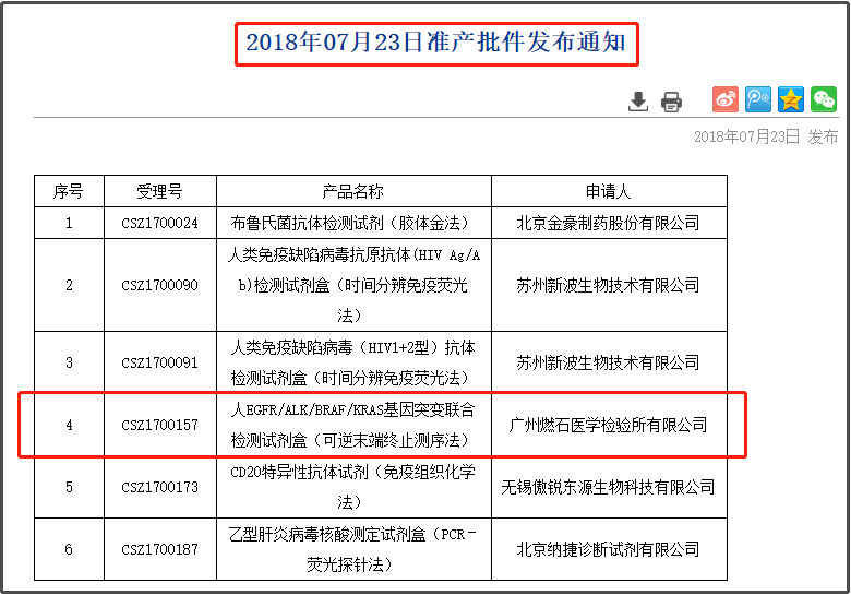 2018年7月23日,国家药品监督管理局批准了广州燃石医学检验所有限公司研制的“人EGFR/ALK/BRAF/KRAS基因突变联合检测试剂盒(可逆末端终止测序法)”,成为中国首个基于高通量测序技术(NGS)以及伴随诊断标准审批的多基因肿瘤突变联合检测试剂盒,将用于帮助非小细胞肺癌患者精准选择靶向药物治疗。