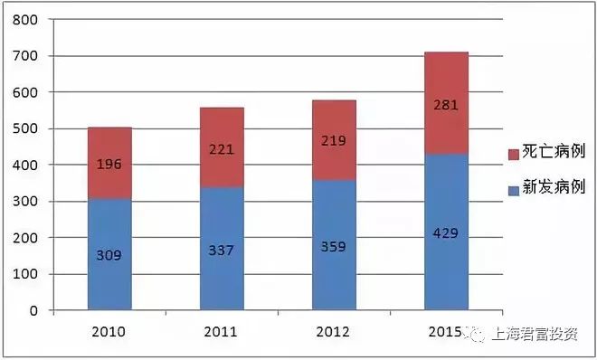 2010-2015 年中国癌症新发及死亡病例(单位:万例)