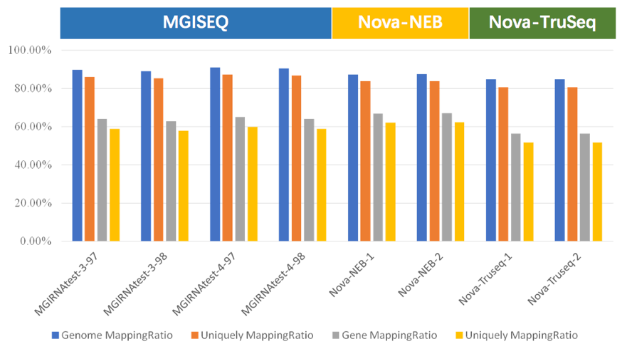 图6 测序平台间比对率对比 MGISEQ-2000平台上的Genome mapping ratio比NovaSeq高约2%,Gene mapping ratio比NovaSeq上比TruSeq的高约6%