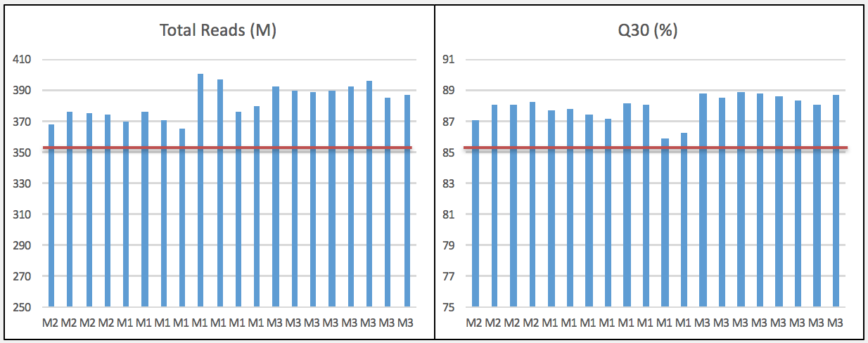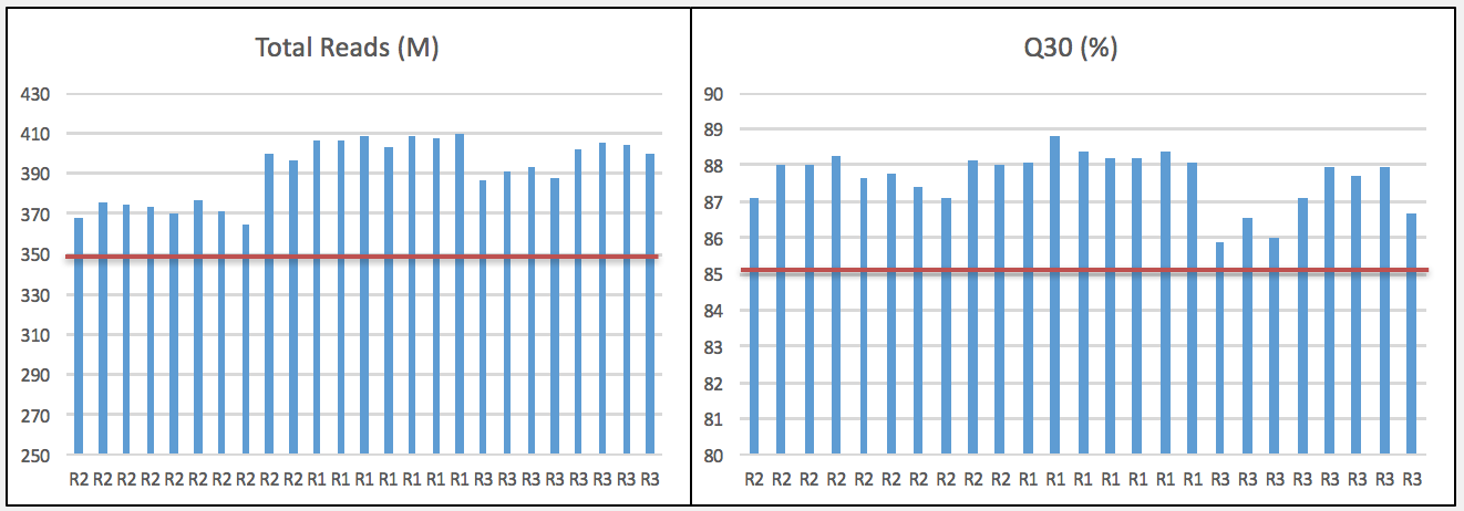图3 仪器间重复性(3台机器,统计20条lane) 数据量CV=2.76%,数据质量CV=0.93%