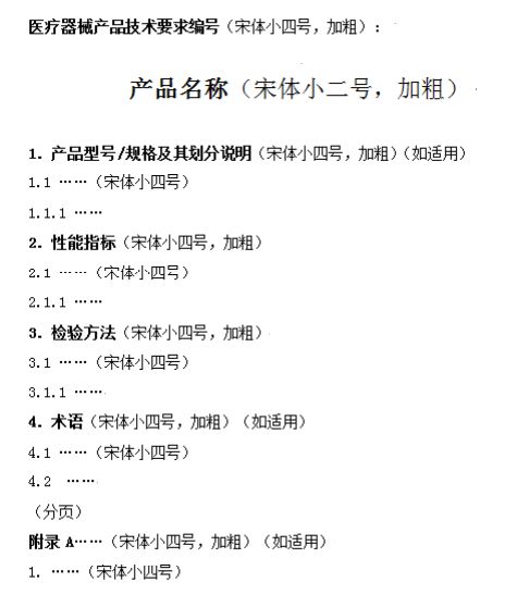 国家局发布的关于产品技术要求的通告 一、基本要求 (一)医疗器械产品技术要求的编制应符合国家相关法律法规。 (二)医疗器械产品技术要求中应采用规范通用的术语。 如涉及特殊的术语,需提供明确定义,并写到“ 4.术语”部分。 (三)医疗器械产品技术要求中的检验方法各项内容的编号原则上应和性能指标各项内容的编号相对应。 即2.1.1的性能指标应与3.1.1的检验方法对应。 (四)医疗器械产品技术要求中的文字、数字、公式、单位、符号、图表等应符合标准化要求。 比如血压单位Kpa和mmHg (五)如医疗器械产品技术要求中的内容引用国家标准行业标准或中国药、行业标准或中国药典,应保证其有效性,并注明相应标准的编号和年号以及中国药典的版本号 二、内容要求 (一)产品名称 产品技术要求中的产品名称应使用中文,并与申请注册(备案)的中文产品名称相一致。 (二)产品型号/规格及其划分说明。产品技术要求中应明确产品型号和/或规格,以及其划分的说明。 1) 对同一注册单元中存在多种型号和/或规格的产品,应明确各型号及各规格之间的所有区别(必要时可附相应图示进行说明)。 2) 对于型号/规格的表述文本较大的可以附录形式提供。对于型号规格的表述文本较大的可以附录形式提供。 (三)性能指标 1. 产品技术要求中的性能指标是指可进行客观判定的成品的功能性 、安全性指标以及质量控制相关的其他指标。产品设计开发中的评价性内容(例如生物相容性评价)原则上不在产品技术要求中制定。 如安全要求:符合GB9706.1-2007、XXXX、YY0505-2012等通用安全及专用安全的要求。 2. 产品技术要求中性能指标的制定应参考相关国家标准/行业标准并结合具体产品的设计特性、预期用途和质量控制水平且不应低于产品适用的强制性国家标准/行业标准。 3. 产品技术要求中的性能指标应明确具体要求,不应以“见随附资料”、“按供货合同”等形式提供。 四)检验方法 检验方法的制定应与相应的性能指标相适应。应优先考虑采用公认的或已颁布的标准检验方法。 检验方法的制定需保证具有可重现性和可操作性,需要时明确样品的制备方法,必要时可附相应图示进行说明,文本较大的可以附录形式提供。 如:工作条件(电源条件、环境条件) 与性能指标相对应 安全要求符合XXXX标准的要求。 对于体外诊断试剂类产品,检验方法中还应明确说明采用的参考品/标准品、样本制备方法、使用的试剂批次和数量、试验次数、计算方法。 (五)对于第三类体外诊断试剂类产品,产品技术要求中应以附录形式明确主要原材料、生产工艺及半成品要求。 (六)医疗器械产品技术要求编号为相应的注册证号(备案号)。拟注册(备案)的产品技术要求编号可留空。