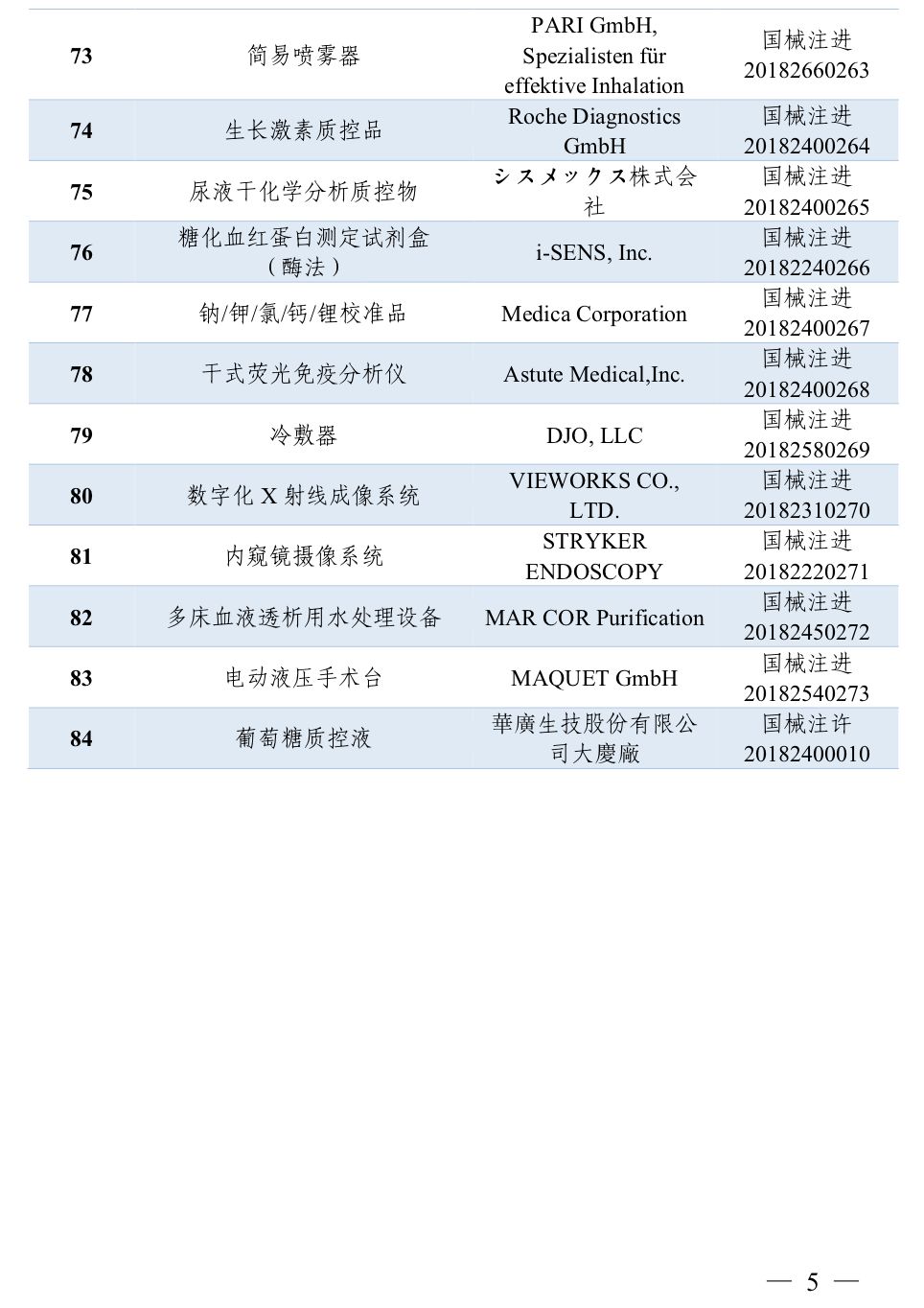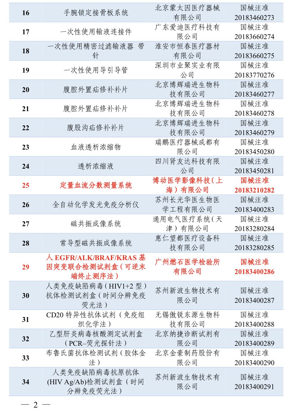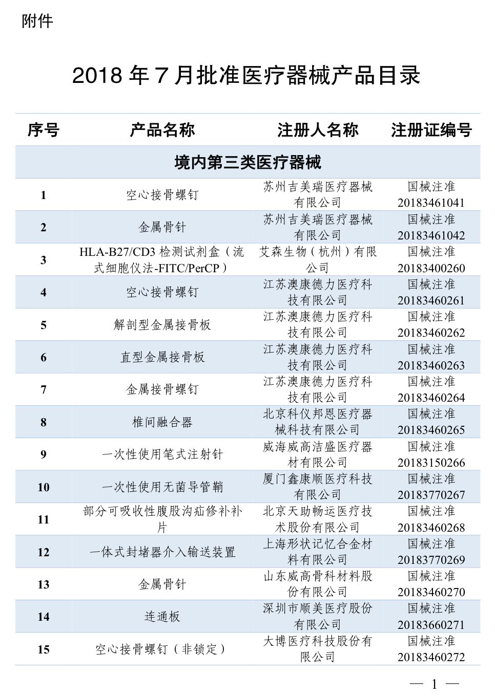 2018年7月,国家药品监督管理局共批准注册医疗器械产品84个。其中,境内第三类医疗器械产品45个,进口第三类医疗器械产品17个,进口第二类医疗器械产品22个(具体产品见附件)。 特此公告。 附件:2018年7月批准注册医疗器械产品目录 国家药品监督管理局 2018年7月,国家药品监督管理局共批准注册医疗器械产品84个。其中,境内第三类医疗器械产品45个,进口第三类医疗器械产品17个,进口第二类医疗器械产品22个(具体产品见附件)。 目录中涉及体外诊断(IVD)企业共有21家,其中境内第三类医疗器械产品8个,进口第三类医疗器械产品2个,进口第二类医疗器械产品11个。 以下为2018年7月批准注册的IVD产品: |