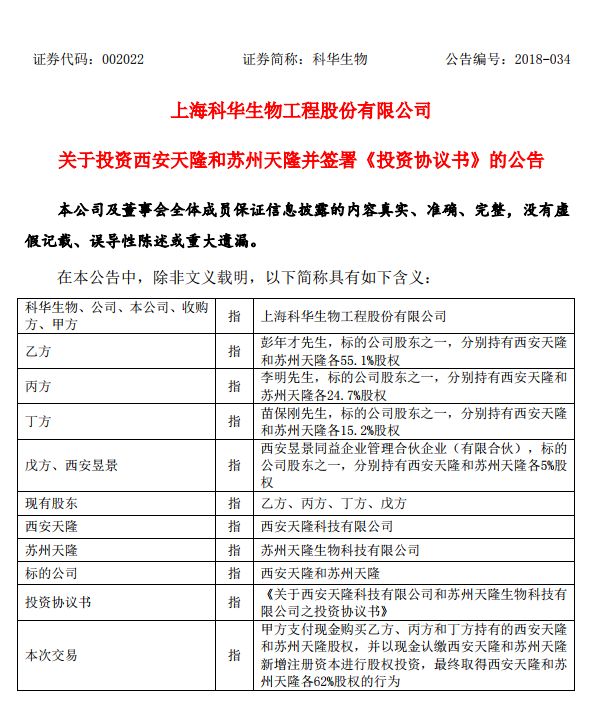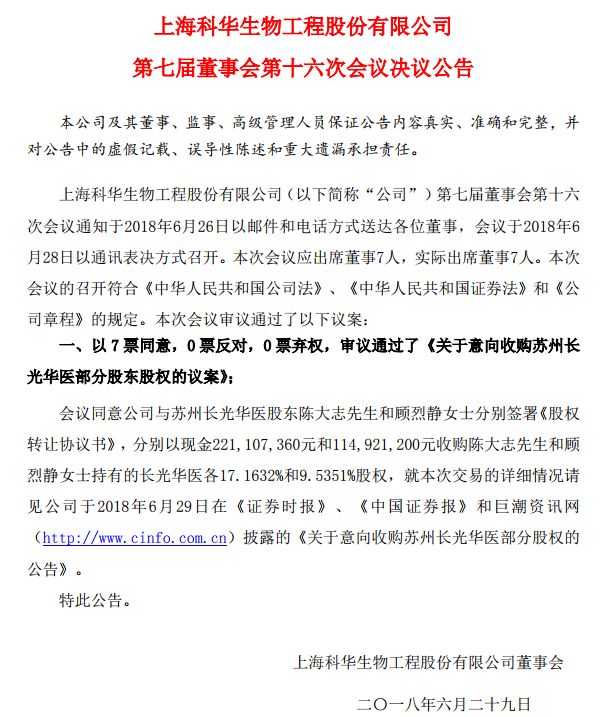 6月29日,科华生物方面公告表示,公司分别与长光华医现有两名股东陈大志和顾烈静签署股权转让协议书,分别以现金2.21亿元和1.15亿元收购陈大志和顾烈静持有的长光华医各17.16%和9.54%股权,在完成意向收购后,公司将持有标的公司26.7%的股权。 点击图片查看相关链接↑