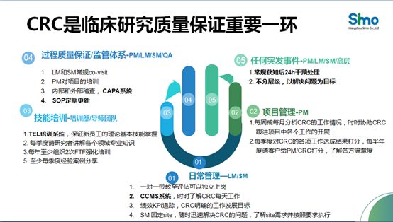 2018年8月31日至9月1日,由江苏省人民医院主办的“新形势下临床研究与创新转化研讨会” 在南京召开。杭州思默医药科技有限公司(以下简称“思默医药”)CEO曹晓春女士应邀出席,以“SMO临床试验质量体系介绍”为主题发表了演讲。 后起之秀—CRC的发展和定位 临床试验现场管理组织(以下简称“SMO”)行业成立之前,研究护士协助研究者进行大量非医学判断性的工作。SMO行业成立之后,临床试验协调员(以下简称“CRC”)作为研究者的助手,在临床研究中扮演着越来越重要的角色。 CRC的定位非常明确:即协助研究者负责填写病历报告表、收集资料等非医学判断性工作。目前,临床研究的很多工作由CRC协助完成,比如临床研究启动前需要CRC的介入等。虽然SMO行业的兴起比合同研究组织(以下简称“CRO”)行业较晚,但是随着SMO行业的发展,行业对CRC的需求越来越大。CRC人数快速增长的同时,其承担的角色变得越来越重要,工作量也相对增多。那么,如何把控CRC的工作质量,如何定位CRC的职业发展,从而让CRC在临床研究中做的更好呢? 曹晓春女士以思默医药为例,从以下五个方面展开分析,并表达了对SMO行业未来发展的憧憬。 纵向考量:带教制度 & 管理体系 思默医药每年都有大量新员工入职。这些都是通过试用期的筛选,认同等来并愿意以CRC为职业长期发展的人才。在思默医药的培训体系中,带教制度对新员工的成长起了非常重要的作用。每个新员工都会拥有一位2年以上工作经验的带教老师对其进行手把手培训,他们在项目过程中通过对每一项工作的从“讲解”“我做你看”到 “你做我看”的分步指导,让新任CRC完全掌握并考核合格,可以胜任项目工作时才让其独立上岗。 CRC独立上岗之后,直线经理们(以下简称“LM”)将继续对CRC进行考核。LM可以通过CCMS工时系统了解CRC每天工作内容,直至确认CRC能独立控制项目质量。此外,思默医药临床协调部会安排定点医院的Site Manager对CRC进行管理,帮助CRC及时解决日常工作中遇到的实际问题,并在绩效考核和培训方面对CRC进行相应的指导。每个新员工入职一个月会有协同访视;部门内部也会利用各种资源完成对CRC进行纵向管理。 横向掌控:培训PM做好团队项目管理 思默医药的项目管理者(以下简称“PM”)一般是由工作3年以上的CRC担任。为了提升PM的管理能力,思默医药每年为PM提供3至4次面对面系统培训,内容围绕管理方法和实践培训等。通过理念更新、风险管理和复盘推演等工具和方法,PM们能做到先成就团队,后而成就自己。 在思默医药,PM有权选择合适的CRC组建自己的项目团队,凭借曾经合作的默契共同努力做好项目工作。PM团队成立之后,PM将对CRC进行方案、试验流程、启动时注意事项等动态的培训。在项目开展过程中,若一个中心产生了问题,PM可将一个中心的问题分享给其他中心,避免类似情况再次出现。并且,PM每月会分析CRC的工作情况,每个季度通过做协同访视对CRC工作进行评估,并与研究者、申办方、监查员沟通了解CRC工作质量,以便有针对性地指导CRC的工作。另外,思默医药每季度对CRC的各项工作进行打分,每半年请合作客户给PM和CRC打分,了解各方满意度,以不断改进和完善。 纵横开阖是为了让CRC逐步的提升处理问题的能力并同步增长项目经验。 规范SOP:完善SOP&不断进步的理念 思默医药拥有独立的标准操作规程(简称“SOP”)。SOP对CRC做的每项工作做了详细的规定,形成了完整的SMO质量控制体系。在项目实施过程中,如内外部稽查等发现问题时,质量保证部门会有针对性地更新SOP,在SOP更新和大改之后再对全员进行培训。面对面、线上这两种不同形式的培训和考核,让CRC在工作之余不断地充电学习。 SMO作为是申办方和CRO公司非常重要的合作伙伴。截止目前,思默医药接受了20多家申办方对思默医药质量体系的稽查,稽查涉及的内容不仅包括思默医药的SOP,还包括财务、行政管理、IT等方面。通过稽查对SOP提出更高的要求,使得思默医药的SOP更加完善。 趋于专业:多渠道提升CRC专业度 思默医药通过多种渠道来提升CRC专业资质。首先,思默医药在CRC职业晋升通道设立了专业岗位,CRC不仅可以向PM、LM方向发展,还设置了MCRC、PCRC等技术层级,鼓励CRC向专业岗位发展,让其在不断积累经验过程中更加专业,也能给其他CRC提供专业技能培训。其次,思默医药每季度请专科研究者对全员CRC进行肿瘤、内分泌等专业知识的培训,提升CRC的专业资质,并将培训内容上传至TEL培训系统,便于CRC自学。再次,思默医药的法务部门会整理国家最新的临床试验相关法规资料,并给CRC进行培训。最后,临床协调部门在每月一次的部门大会上进行案例的即时分享,通过分享让CRC学到更多的专业知识,这不仅增长了CRC现有的项目经验,也让其通过互相学习得到更多的成长。 对于特殊的项目,比如放射性同位素标记项目,现已对部分CRC进行了培训,让CRC更专业、更有针对性的去做项目。 整体把控:企业文化与实践协同并进 质量体系不仅仅围绕内部的SOP和项目管理计划,而且围绕整个公司和临床研究,从财务、行政、信息系统、内部控制等给予支持并进行整体把控。以合同模板为例,随着临床试验的广泛开展,各地不断增加新的临床试验机构,每个机构有自己的合同模板;国内申办方也有自己的合同模板。思默医药的法务部门会对不同的合同模板进行把控,以确保