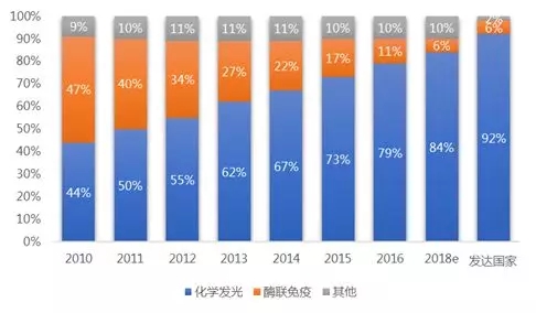 图3:中国化学发光市场格局 数据来源:嘉赋资本,火石创造整理 自2010年至2016年,国内免疫诊断领域化学发光占比从44%增长至79%,发展非常迅速,但相比发达国家92%的比例,国内化学发光仍有一定的替代空间。