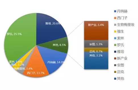 图2:国产二类和三类化学发光产品历年注册数量 数据来源:CFDA 市场格局 与生化诊断国内外厂家共同竞争不同,由于化学发光免疫技术门槛高,研发难度大,国内90%的化学发光市场被进口厂家垄断。罗氏、雅培、丹纳赫、西门子为代表的四大巨头占据了国内80%以上的化学发光市场。 近年来,国产化学发光品牌突出重围:新产业研发出国内首台全自动管式化学发光仪,并以繁多的检测项目、巨大的价格优势以及完备的营销策略,迅速抢占国内市场,使新产业成为国内化学发光领域的龙头企业;安图生物在2013年推出自主研发的磁微粒式化学发光试剂,与传统的板式化学发光产品相比检测速度更快、更灵敏,为公司带来巨大的利润增长。