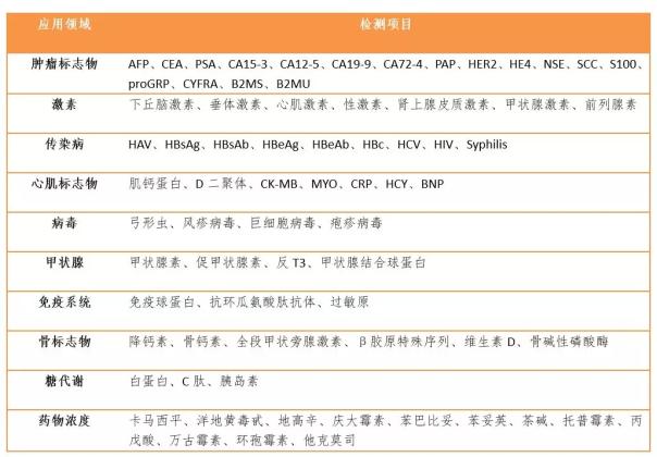 化学发光免疫分析方法 (chemiluminescence immunoassay ,CLlA) 创建于1977 年,由 Halmann 等人在RIA和EIA理论的基本上,将免疫反应的高特异性与化学发光的高灵敏性结合起来,建立的一种用于检测微量抗原、抗体、激素、酶等的新型免疫学分析方法。 化学发光主要应用领域 化学发光检测内容涵盖肿瘤标志物、激素、传染病、心肌标志物等主要检测领域以及病毒、甲状腺、免疫系统、骨标志物、糖代谢等检测领域。国际巨头一般产品线齐全,同时覆盖诸多检测项目,但是也各有优势领域。 1. 肿瘤标志物——罗氏 肿瘤标志物检测是罗氏特色,其提供的肿瘤标志物检测超过20种,基本涵盖了目前临床常见的肿瘤检测,尤其在胃癌标志物CA72-4,肺癌标志物NSE,肺癌和乳腺癌标志物CYFRA21-1,恶性黑色素瘤标志物S100检测的地位无人撼动。罗氏电化学发光法是其核心技术,该技术专利已于2016年正式到期。目前罗氏化学发光项目超过100项,项目覆盖齐全,菜单功能丰富。 2. 传染病——雅培 传染病检测是雅培特色,采用吖啶酯直接化学发光法。在传染病检测领域具有较高的权威性,终端客户群忠诚度高。 3. 激素——西门子 西门子通过并购布局体外诊断领域,化学发光检测项目种类丰富,涵盖肿瘤检测、骨代谢、糖尿病、传染病、激素等各方面,相对而言在激素类标志物有一定优势。 4. 性激素——丹纳赫 丹纳赫在性激素检测方面独树一帜,其中DXI系列是高速仪器,采用微粒子酶促发光原理,检测速度达400检测/小时。其拥有全球专利的抑制素A检测试剂,在产前筛查有重要应用,能大大提高筛查疾病的检出率及降低假阳性率。 表1:化学发光棉衣诊断主要应用领域
