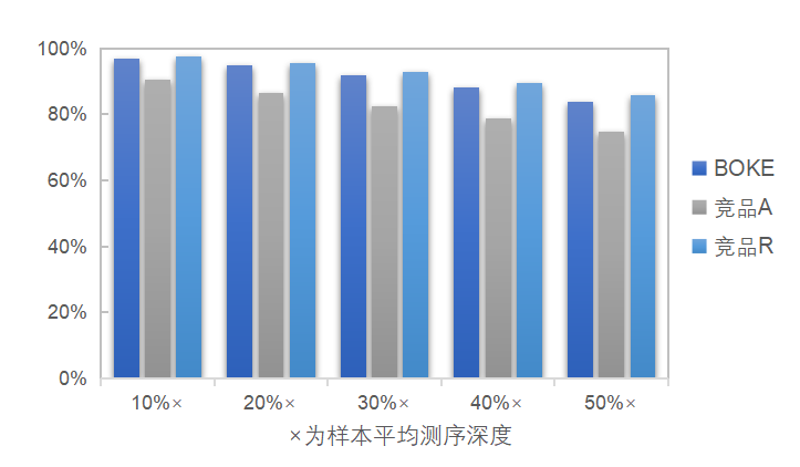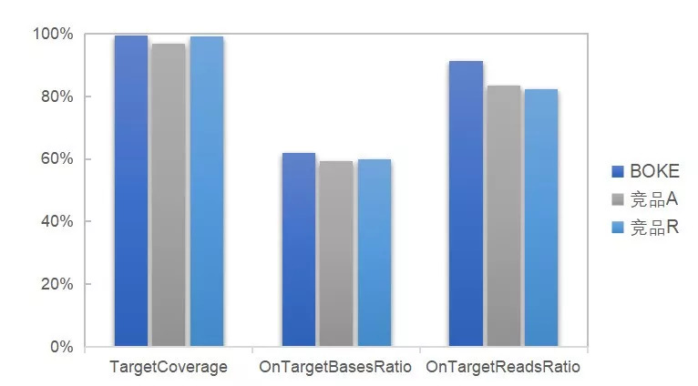 图1. BOKE TargetCap™捕获效率优异 与竞品相比,BOKE TargetCap™在目标区域均一性上有着突出的表现,测序深度大于10%平均测序深度的碱基比例达到目标区域97%(图2)。更高的目标区域均一性意味着可以使用最少的测序量达到对变异位点的更有效检出,降低测序成本。