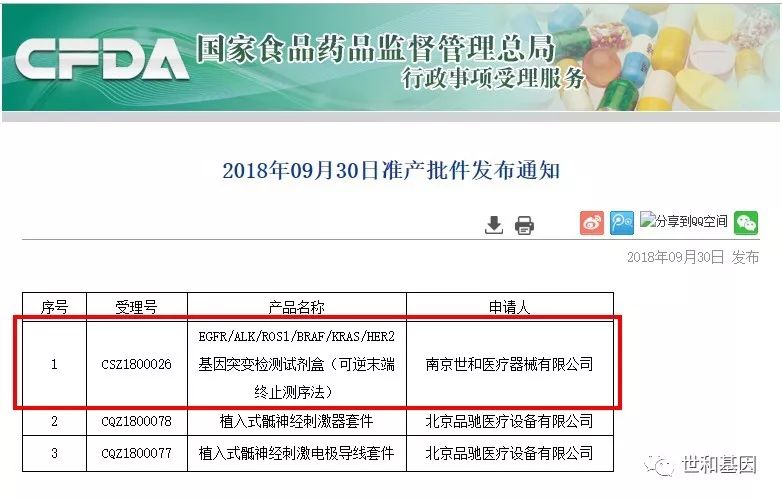 以最隆重的献礼为祖国庆生! 今日,南京世和医疗器械有限公司“EGFR/ALK/ROS1/BRAF/KRAS/HER2基因突变检测试剂盒(可逆末端终止测序法)”,通过总局创新医疗器械特别审批程序,正式获批上市。 本试剂盒共检测14个基因,其中6基因(EGFR、ALK、ROS1、BRAF、KRAS、HER2)获批用于检测非小细胞肺癌(NSCLC),全面实现肺癌靶向用药基因全覆盖。值得一提的是,伴随诊断也有多项获批:EGFR基因19外显子缺失及L858R点突变用于吉非替尼片及盐酸埃克替尼片的伴随诊断检测,T790M点突变用于甲磺酸奥希替尼片的伴随诊断检测;ALK基因融合用于克唑替尼胶囊的伴随诊断检测;ROS1基因融合用于克唑替尼胶囊的伴随诊断检测。这意味着,国内精准医疗的步伐已经突破“一种检测对应一种药物”模式,而进入了“一种检测对应一个患者”的模式。 世和在试剂盒研发过程中始终坚持从患者出发、从临床出发,真正实行一次检测、覆盖所有靶点,更包含已批药物靶点基因ROS1融合以及NCCN指南包含的用药基因HER2。 世和EGFR/ALK/ROS1/BRAF/KRAS/HER2基因突变检测试剂盒(可逆末端终止测序法)(以下简称为“世和NGS肺癌多基因试剂盒”),是目前国内涵盖基因最多的NGS检测试剂盒。EGFR/ALK/ROS1/BRAF/KRAS/HER2这6个基因均为《非小细胞肺癌NCCN》指南中明确指出需要检测的驱动基因,全面指导肺癌靶向药物治疗方案,大大增加了NSCLC患者接受靶向治疗的机会。 此外,本试剂盒同时检测RET、MET、PIK3CA、NF1、PTEN、NRAS、AKT1、MEK1这8基因,不仅有肺癌靶向治疗、耐药相关基因,还有下游信号通路的重要节点基因,真正做到肺癌靶向用药相关基因的全覆盖! 世和NGS肺癌多基因试剂盒对于EGFR、ROS1、BRAF、KRAS及HER2的检测灵敏度达1%,ALK融合的检测敏感度达2.5%,不仅是对传统检测的超越,同时也显著优于同批次其他NGS检测试剂盒。肺癌多基因试剂盒,一次检测覆盖点突变、插入缺失、融合等多种变异类型,可以为患者提供更全面、更精准的靶向治疗解决方案。 本试剂盒经过中国医学科学院附属肿瘤医院、江苏省人民医院、首都医科大学附属北京胸科医院共三个中心、过千例临床样本的临床试验验证。在与已上市产品/金标准方法(荧光PCR法、荧光原位杂交、Sanger测序)的比较研究中,总体符合率98%以上。在与EGFR、ALK、ROS1伴随诊断试剂的比较研究中,总体符合率99%以上。与靶向药物吉非替尼、埃克替尼、奥希替尼、克唑替尼疗效相关的回顾性临床研究证实:根据本试剂盒检测结果用药的NSCLC患者,临床用药客观缓解率与既往药物临床试验相符! 世和NGS肺癌多基因试剂盒基于Illumina测序平台开发,精确度高,实验快捷,便于操作。此前,世和基因已与Illumina达成战略合作,为进一步推动国内肿瘤精准医疗的发展,不断探索出新的临床解决方案。