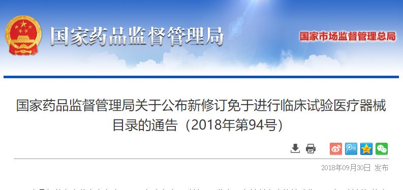 就在今天,国家药品监督管理局发布了关于公布新修订免于进行临床试验医疗器械目录的通告(2018年第94号)。