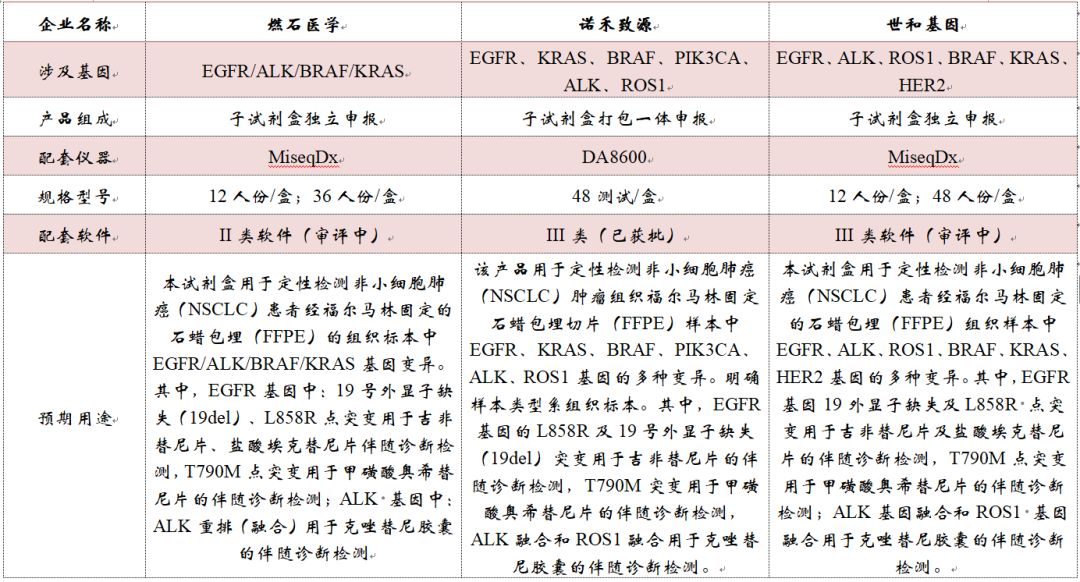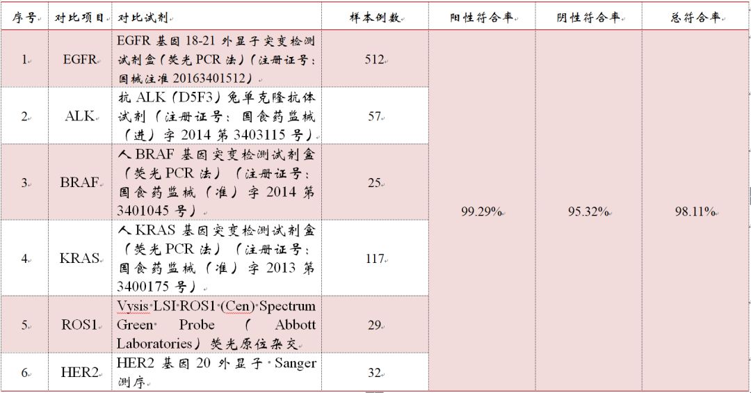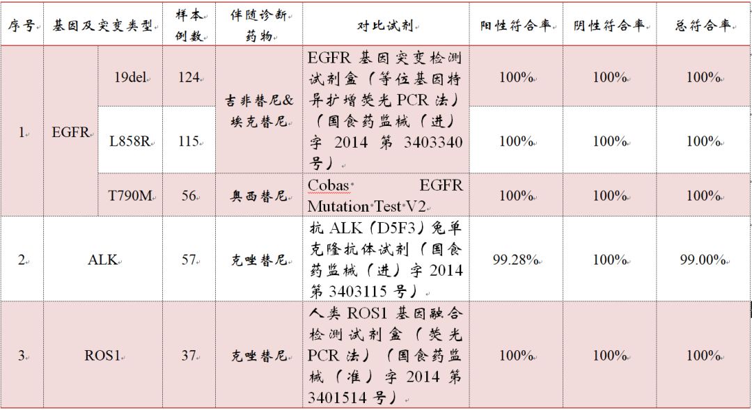 2018年7月23日,NMPA(原CFDA)批准了广州燃石医学检验所有限公司的高通量检测创新产品 “人EGFR/ALK/BRAF/KRAS基因突变联合检测试剂盒(可逆末端终止测序法)”的三类医疗器械产品的注册—— “肿瘤NGS第一证”。 很快的,2018年8月13日,NMPA又批准天津诺禾致源“人EGFR/KRAS/BRAF/PIK3CA/ALK/ROS1基因突变检测试剂盒(半导体测序法)” 的三类医疗器械产品上市。 燃石与诺禾致源NGS-Kits的相继获批,市场对世和基因、飞朔生物、华因康基因、艾德生物、华大基因的NGS产品也更为关注与期待。终于,2018年9月30日,在这举国欢庆的节日来临之际,NMPA也给基因检测行业送上了一份厚厚的大礼——“EGFR/ALK/ROS1/BRAF/KRAS/HER2基因突变检测试剂盒(可逆末端终止测序法)”终获NMPA批准。 近日,CMDE公布了世和基因的审评报告,小编进行如下整理汇编。 ▽世和、诺禾&燃石NGS-Kit数据对比 试剂组成 首先,诺禾产品主要组成成分包括文库构建试剂盒、文库定量试剂盒、模板制备试剂盒、模板制备溶液盒、耗材盒、测序试剂盒、测序溶液盒,共计有7个子试剂盒。相比较,燃石与世和的盒子较为简单,选择将组分中的部分子试剂盒进行一类备案。 其次,世和与诺禾的配套软件均按照III类器械进行注册申报。其中,诺禾的NGS软件已经获批,快讯|诺禾致源Novogene国内首个基于NGS分析软件获批,世和稍显滞后,但也已在审评阶段。而燃石按照II类申报,目前已经注册发补阶段,顺利的话年底可拿证。 适用机型 世和与燃石的盒子都是基于illumina平台,适用机型系MiseqDx。据了解,此型号产品illumina公司在2014年即启动进口注册,刚刚获得NMPA批准,快讯|四年漫漫路,MiseqDx终获CNDA批准。诺禾的盒子是基于中山大学达安基因股份有限公司生产的DA8600,注册证号:国械注准20143401961。 预期用途 本试剂盒用于定性检测非小细胞肺癌(NSCLC)患者经福尔马林固定的石蜡包埋(FFPE)组织样本中EGFR、ALK、ROS1、BRAF、KRAS、HER2基因的多种变异。其中,EGFR基因19外显子缺失及L858R 点突变用于吉非替尼片及盐酸埃克替尼片的伴随诊断检测,T790M点突变用于甲磺酸奥希替尼片的伴随诊断检测;ALK基因融合和ROS1 基因融合用于克唑替尼胶囊的伴随诊断检测。 ▽伴随诊断用途的基因变异类型及相应的靶向药物 ▽未经伴随诊断验证的基因突变类型 世和与燃石的伴随诊断药物相同,均为吉非替尼片、盐酸埃克替尼、奥希替尼以及克唑替尼。诺禾则未对埃克替尼进行伴随诊断研究。 临床研究 >>>>(一)与已上市试剂或金标准方法的比较研究 1、临床机构:中国医学科学院附属肿瘤医院、南京医科大学第一附属医院(江苏省人民医院)、首都医科大学附属北京胸科医院共 3 家。 2、样本例数:入组样本为 960 例非小细胞肺癌样本和 46 例良性组织干扰样本,共计 1006 例有效样本。阳性率95.43%。样本类型为石蜡包埋组织。 本临床试验共检测出 716 例基因变异阳性样本,阳性率为 71.17%(其中 56 例含有大于 1 种基因变异,占阳性样本数的 7.82%)。包括 EGFR 基因中 203 例 19 外显子缺失突变阳性、 192 例 L858R 突变阳性、 41 例 T790M 突变阳性、 47例 G719 位点突变阳性及 29 例 L861Q 突变阳性; ALK 基因中 57 例 ALK 基因融合阳性; ROS1 基因中 29 例 ROS1 基因融合阳性; BRAF 基因中 25 例 V600E 突变阳性; KRAS 基因中 97 例 G12 位点突变阳性及 20 例 G13 位点突变阳性;HER2 基因中 32 例 20 外显子插入突变阳性。 ▽考核试剂与对照试剂比对数据 3、不一致验证:考核试剂与对比方法结果不一致的样本共 19 例,主要分为两方面原因:(1)8 例为考核试剂检测范围超过对比方法;(2)11 例可能为不同检测方法间的差异,其中 3 例为考核试剂检测 HER2 20 外显子插入阳性且突变比例已低于Sanger 测序最低检测限;1 例为对比方法免疫组化检测 ALK基因融合阳性但无法显示具体融合形式;余下 7 例经 Sanger测序验证,6 例结果与考核试剂一致,1 例结果与对比方法一致。 >>>>(二)与伴随诊断试剂的比较研究 试验目的:在一致性临床研究基础上,深入评估考核试剂与已经充分联合药物临床评价的伴随诊断试剂的一致性。 1、EGFR 临床机构:中国医学科学院肿瘤医院、首都医科大学北京胸科医院 ,共计2 家临床机构。 样本类型:入组样本为比较研究(一)中已入组及部分新入组样本,共入组 323 例 NSCLC FFPE 组织样本。 2、ALK基因 临床机构:中国医学科学院附属肿瘤医院、南京医科大学第一附属医院(江苏省人民医院)、首都医科大学附属北京胸科医院共 3 家机构。 样本类型:入组样本为比较研究(一)中已入组样本,共入组 1006例 NSCLC FFPE 组织样本。 3、ROS1基因 临床机构:中国医学科学院肿瘤医院及首都医科大学北京胸科医院 2 家临床机构。 样本类型:入组样本为(一)比较研究中已入组及部分新入组样本,共入组 323 例NSCLC FFPE 组织样本。 ▽考核试剂与已上市CDx试剂比对数据 其中,针对EGFR19del及L858突变的,世和CDx选择了Roche的cobas EGFR Mutation Test,注册证号:国食药监械(进)字2014第3403340号。诺禾则选择了凯杰Kit,注册证号为国食药监械(进)字2014第3400761号。燃石则选择cobas® EGFR Mutation Test v2。针对T790M位点,世和与燃石、诺禾致源选择的对照品一致,均为Roche的Cobas V2。 针对ALK融合基因,世和基因与燃石、诺禾的选择有所差异,燃石与诺禾选择的均是Abbott的Kit,世和则选择了Roche的VENTANA anti-ALK (D5F3) Rabbit Monoclonal Primary Antibody,注册证号:国食药